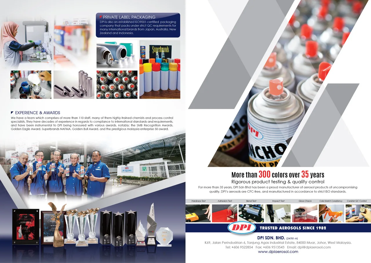 For more than 35 years, DPI SDN BHD has been a proud manufacturer of uncompromising quality aerosols. Utilizing automated production lines, state-of-the-art blending and packaging technologies, we have a mission to make safe and dependable products for everyone. All DPI's aerosols are CFC free and manufactured in accordance to strict ISO standards.