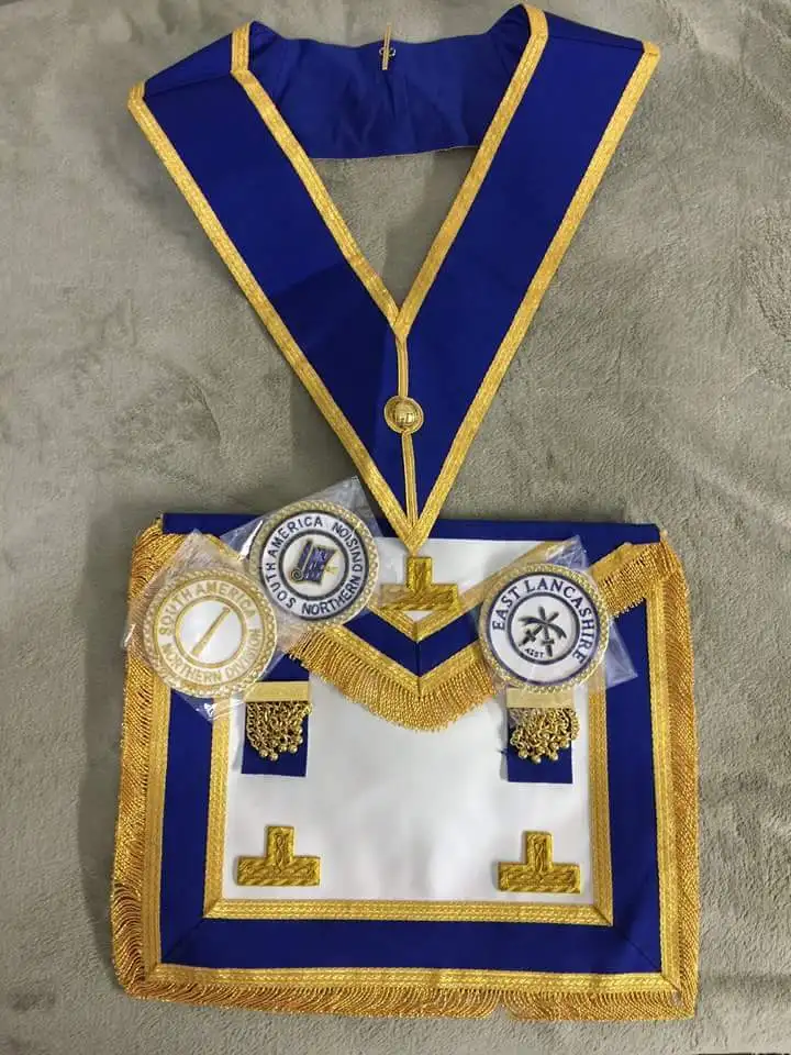 Masonic Regalia Apron Different Ribbon colors ,Artificial leather ,Machine embroidery Gold, All around tassels , Braid grip belt with Gold snake set , Back side pocket for gloves with heat transfer skull sticker. & any customized regalia we are able to make Thanks