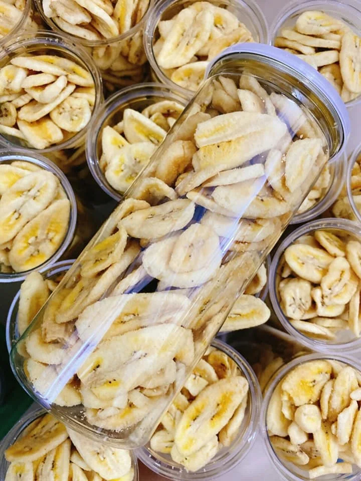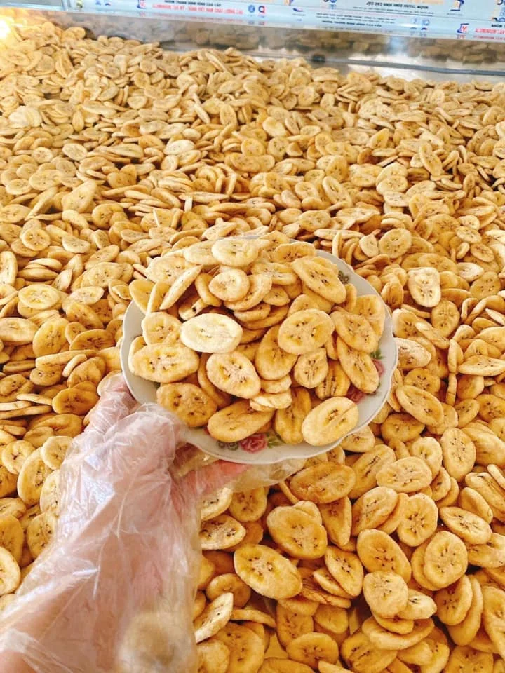 - Crispy dried bananas are produced by vacuum frying technology. Banana raw materials are fried under vacuum conditions, leading to low temperature frying (<100°C), which helps the product to be crispy, bright in color, and the content is retained at the highest level.