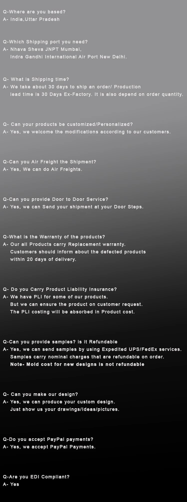 We have hired an adroit team of employees, which keeps themselves abreast with advanced manufacturing techniques and designs. Further, we also have a quality control unit, wherein, we check our entire range on defined parameters like design, quality and finish. All units and equipped with all the essential tools, machine, and technology in order to manufacture a high-quality range of products