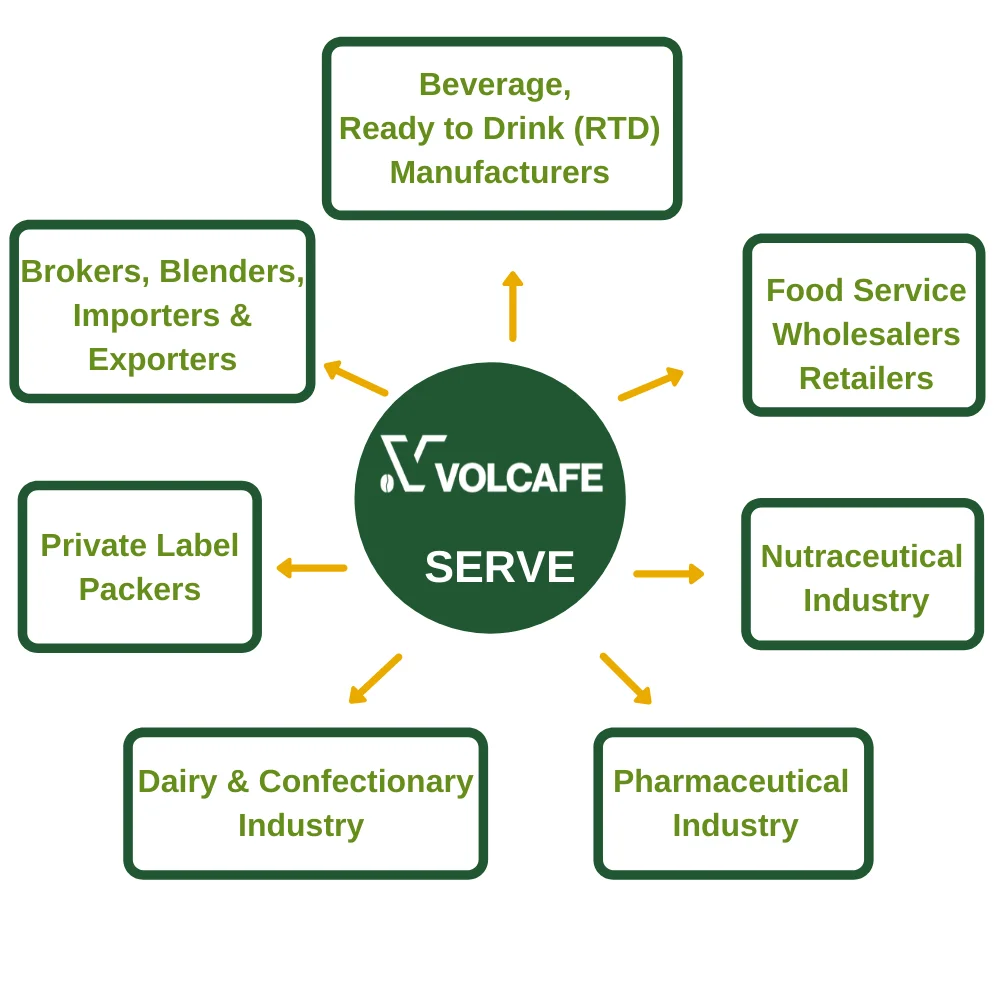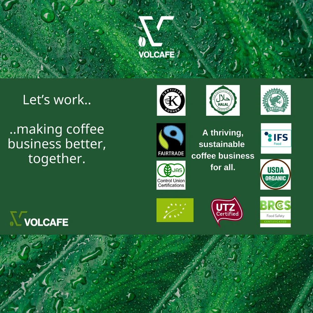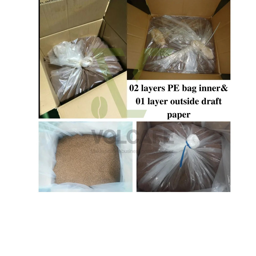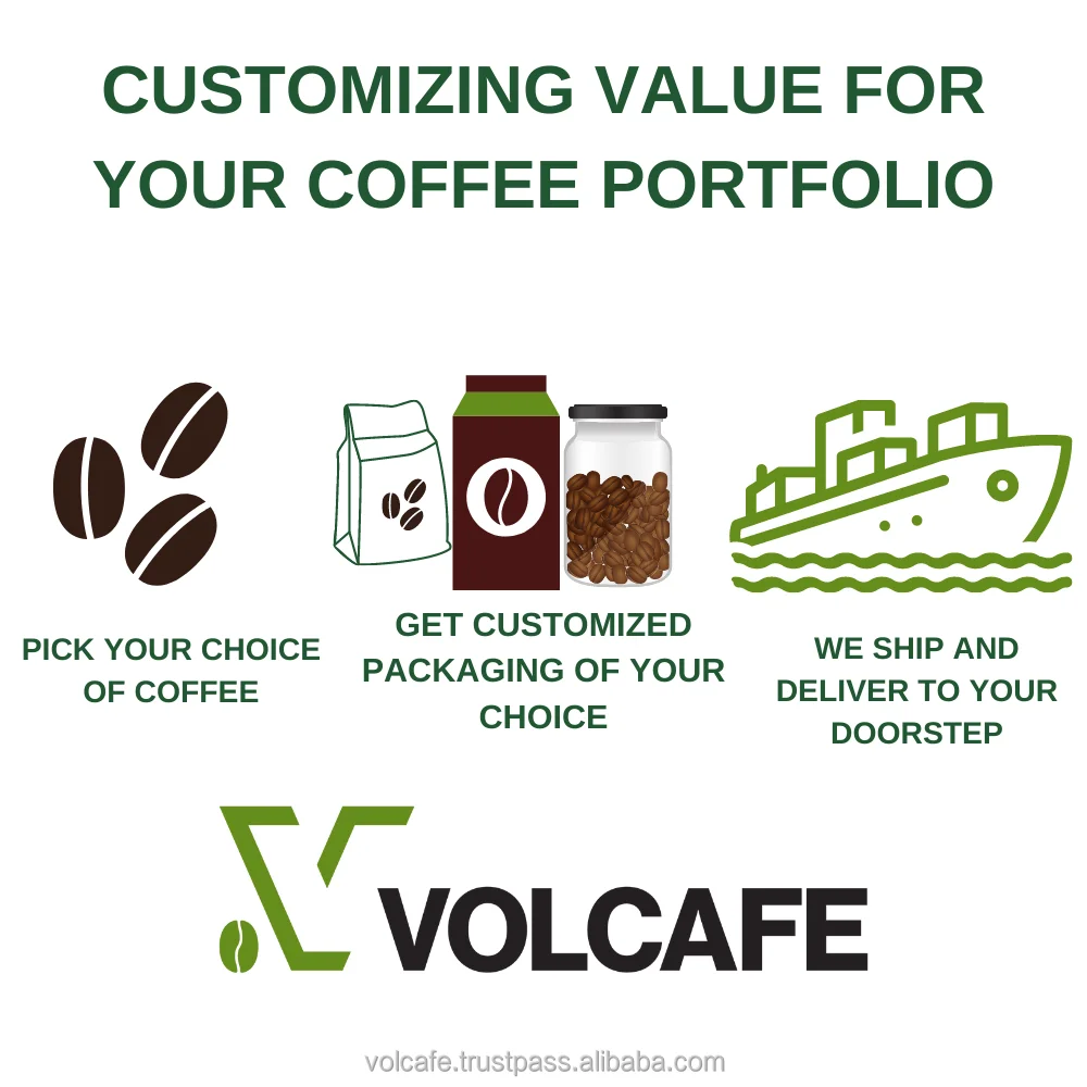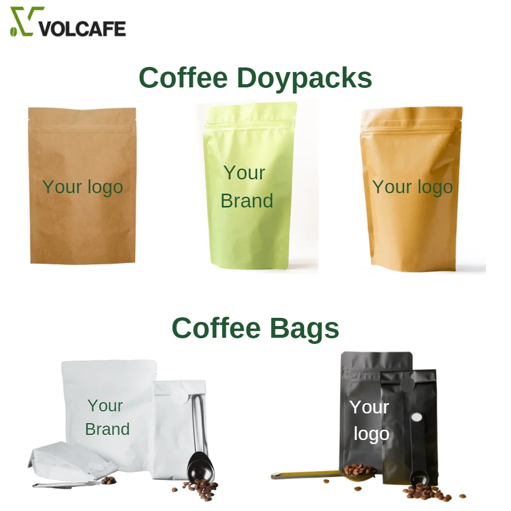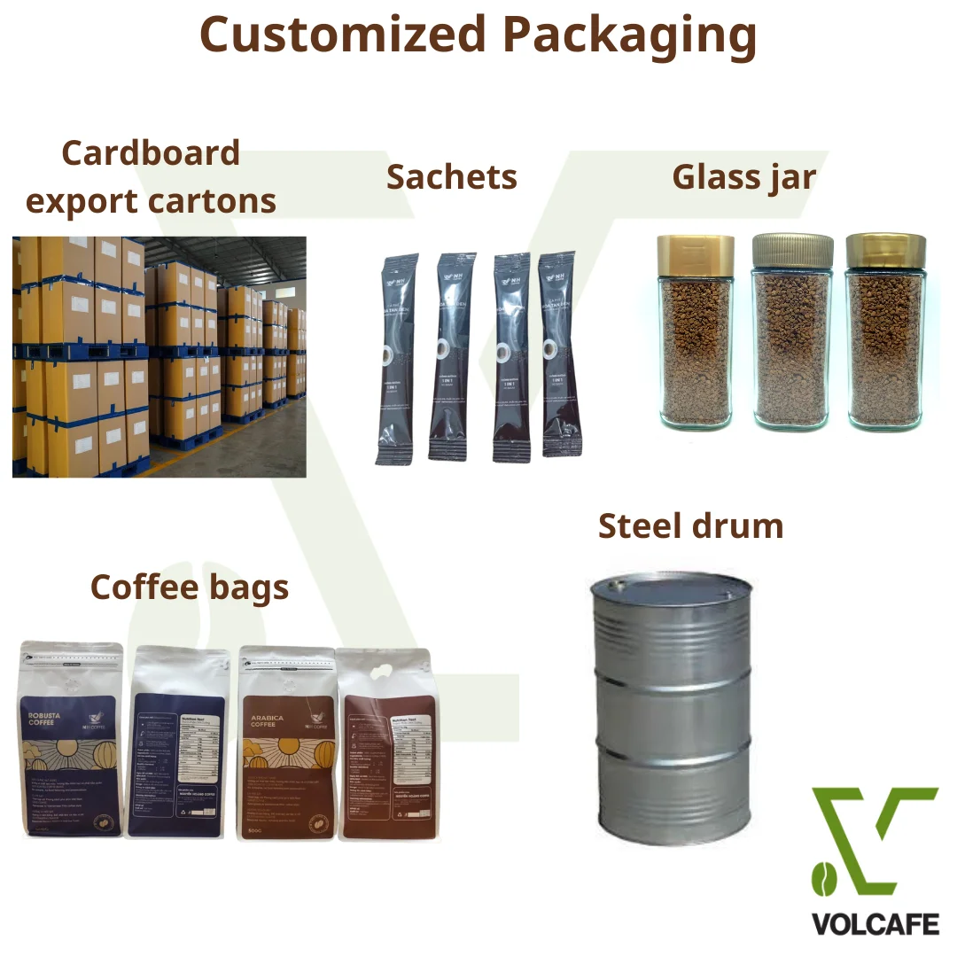 Packaging Bulk and customized with your brand. | Roasted Coffee Beans packaging 0.5kg/ 1kg/ 5kg with private label and packed in vacuum or gas-flushed packs. Aluminum foil coffee bag is one of the most popular used pouch packages for roasted coffee beans and coffee powder products in the market. Soluble Coffee Packaging: 25kgs per Carton/ Glass Jar (100g-200g), Sachets, Stick (2g-18g-25g-50g). |