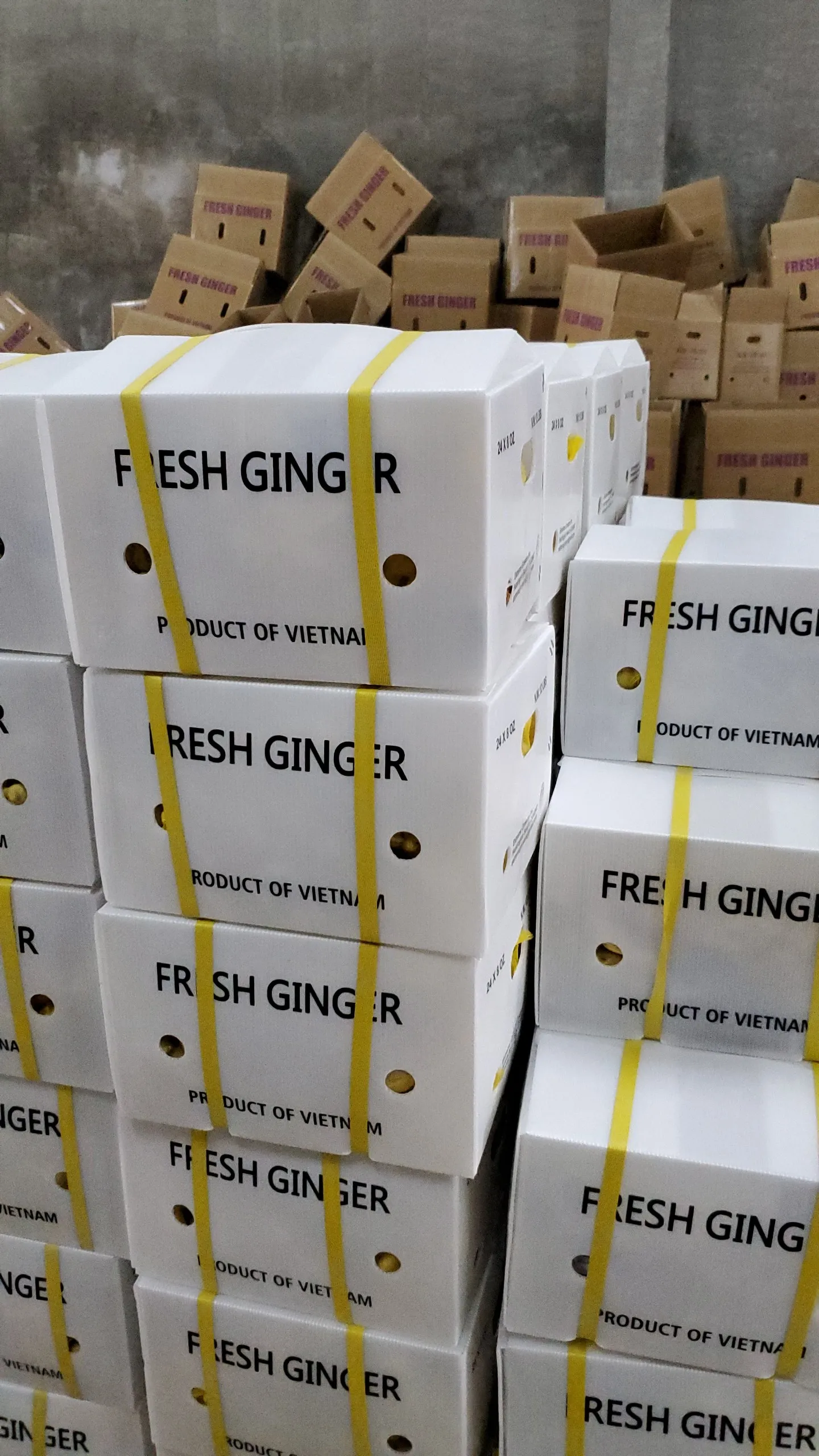 (underground stem) which is widely used as a spice. The rhizome is brown, with a corky outer layer and pale-yellow scented center. The above ground shoot is erect and reed-like with linear leaves that are arranged alternately on the stem. The shoots originate from a multiple bases and wrap around one another. The leaves can reach 7 cm (2.75 in) in length and 1.9 cm (0.7 in) broad. Flowering heads are borne on shorter stems and the plant produces cone shaped, pale yellow flowers . The ginger plant can reach 0.6–1.2 m in height (2–4 ft) and is grown as an annual plant. Ginger may also be referred to as true ginger, stem ginger, garden ginger or root ginger and it is believed to have originated in the Southeast Asia.