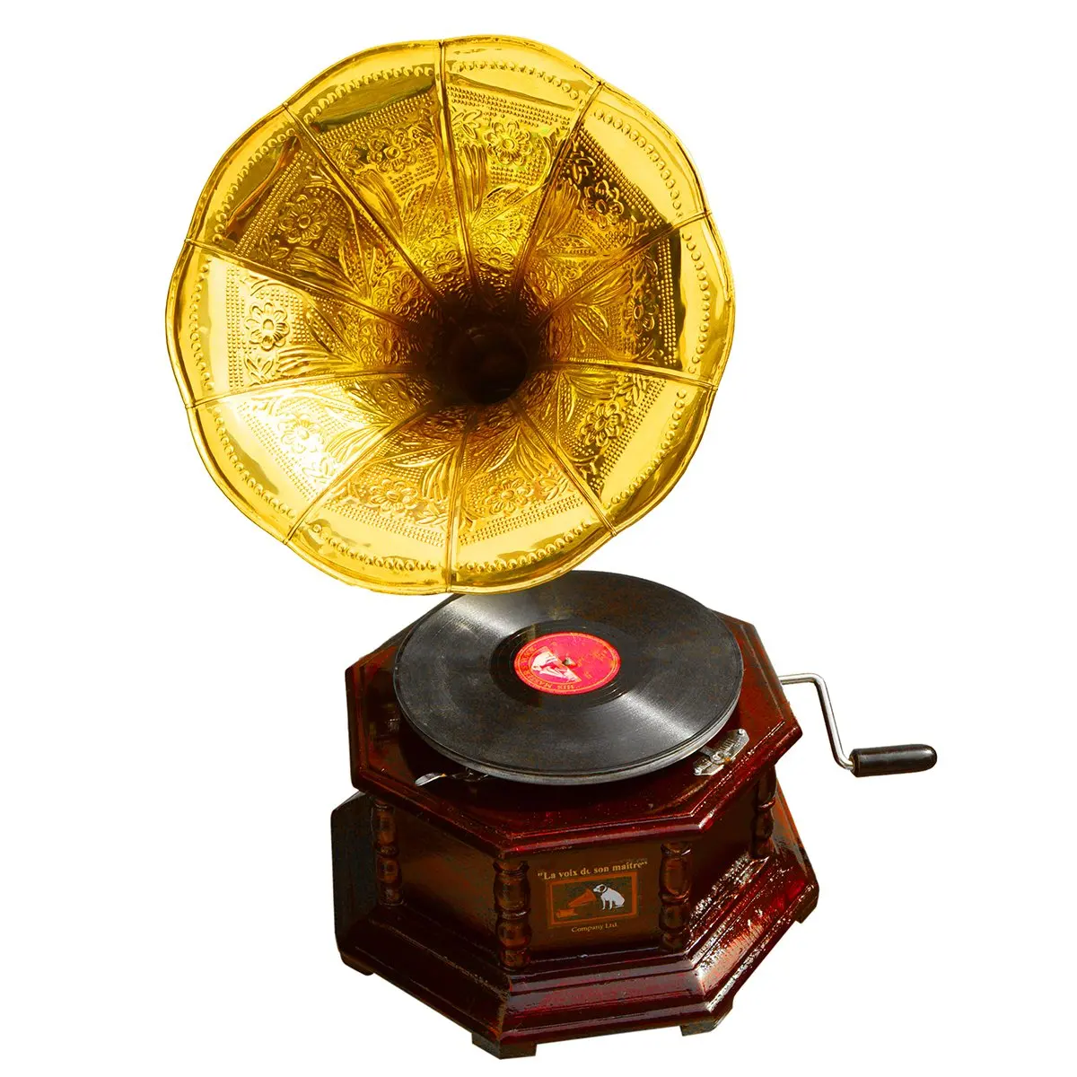 A gramophone plays records: discs with grooves that are amplified by a needle. It's a relic today, but at one time this turntable device was the chief means by which recorded music made its way to the ears of home listeners.