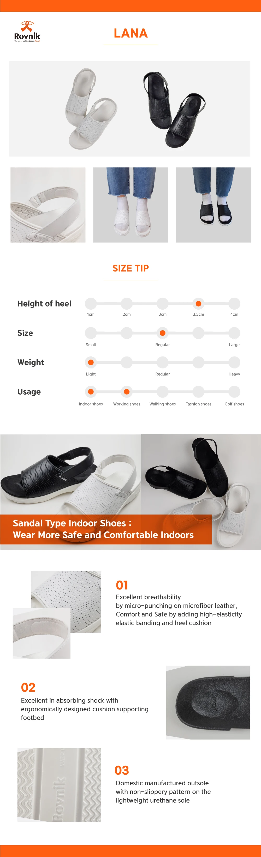 Sandal Type Indoor Shoes : Wear More Safe and Comfortable Indoors Excellent breathability by micro-punching on microfiber leatherComfort and Safe by adding high-elasticity elastic banding and heel cushion Excellent in absorbing shock with ergonomically designed cushion supporting footbed Domestic manufactured outsole with non-slippery pattern on the lightweight urethane sole