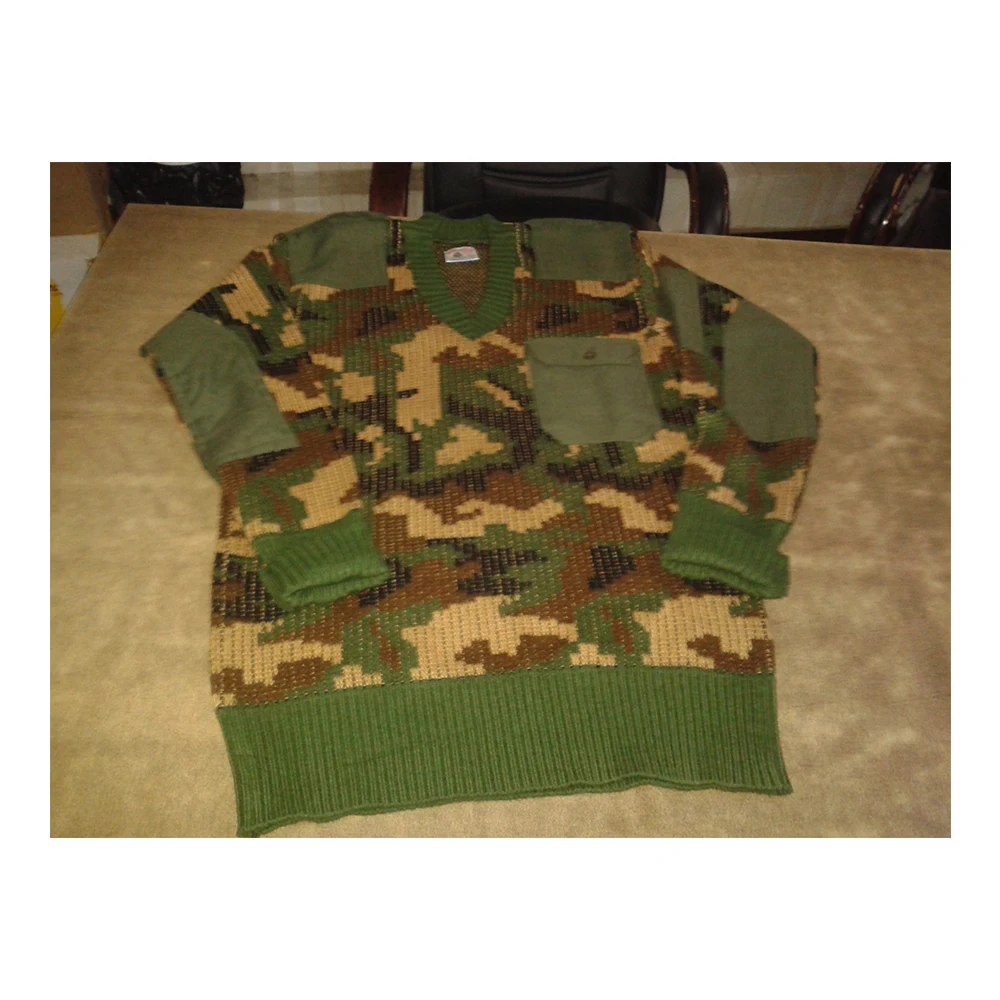 V/round neck, T/C 65/35 patches on shoulder and elbow part, one pocket in the high left of the chest with cover plus one small pen pocket in the left hand. Plain color and universal camouflage design pullover for military forces.