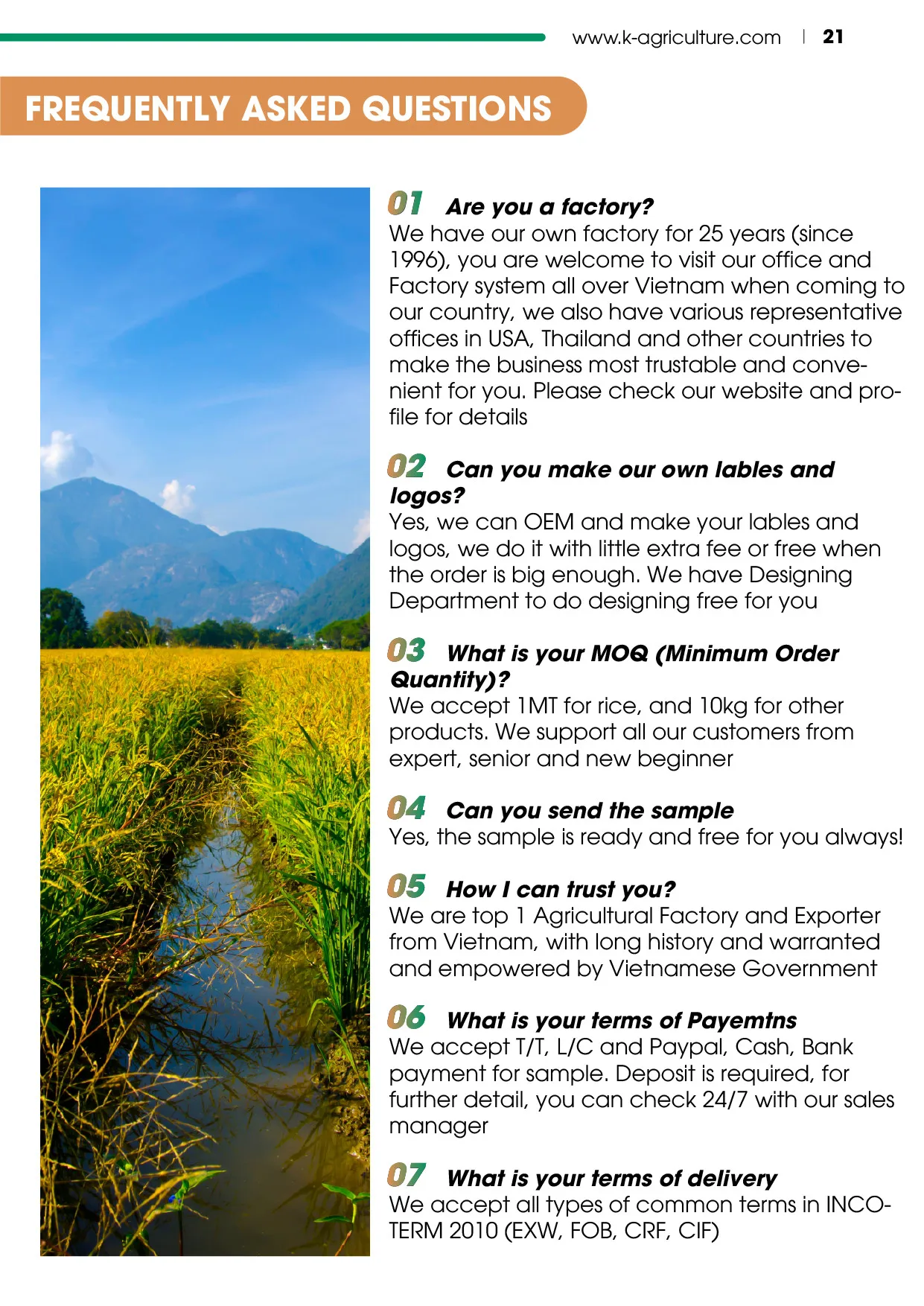 K-Agriculture Company was established in 1996 as a small merchant with the original goal to export rice, corn, and nut from Vietnam to China. Up to now, our company has extended more Vietnamese-branded coffee and Cashew nut.