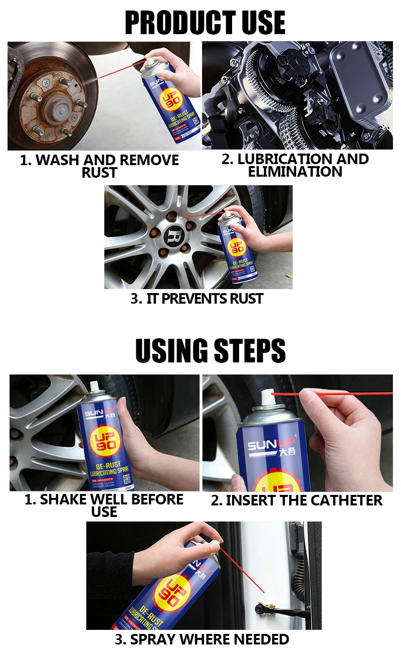 SUNUP De-rust Lubricant Spray can be widely used to remove rust from vehicle ship,household,factory,engine room and tool.it can quickly penetrate in rust and slacken the rust. It can eliminate the noise caused by rust on component and mobile device. lt also can clean and lubricate various machine,reduce moisture and prevent rusting.
