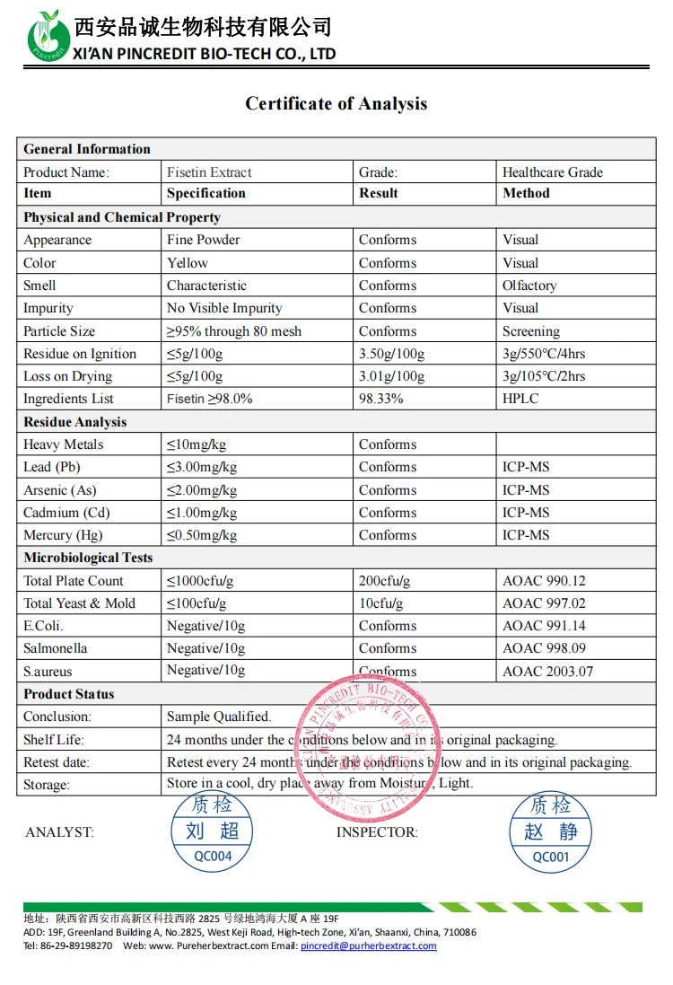 Pincredit supply 50% and 98% fisetin powder, which have been certificated with the third party test report. Sample is provided to check the quality if you need.
