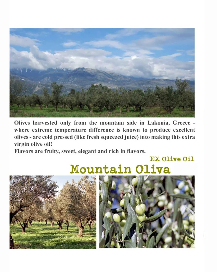 Ordinary olive oils are usually a blend from different regions and the tastes are usually more bitter and acidic. Our product, “EX Olive Oil Mountain Oliva”, is made only by cold pressing the olives only from Lakonia in Greece. Olives are simply compressed (the process of cold press) in the temperatures below 27℃ to make it into the oil - you will be able to taste the olives, just like you are tasting a fresh squeezed juice. Use of this olive oil is numerous - from cooking pasta, sautéing vegetables, making salad dressing, for simply putting on bread, to sprinkling on tofu or sashimi – you will taste and enjoy the true flavor of the olives!