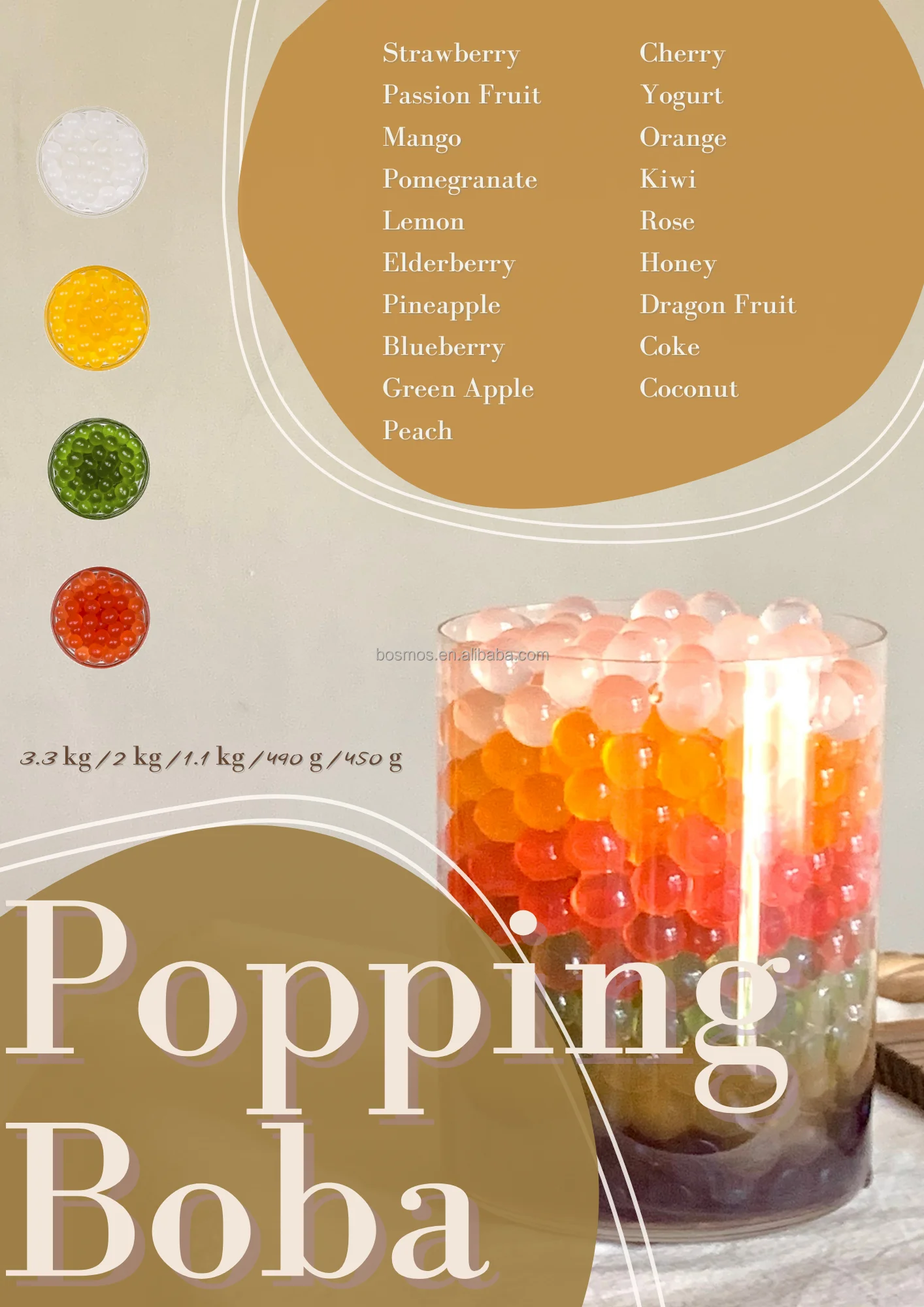 Available Flavors | Strawberry, Mango, Lychee, Passion fruit, Peach, Honeydew, Pineapple, Red Guava, Grapefruit, Green Apple, Orange, Raspberry, Blueberry, Lemon, Lavender, Rose, Yogurt, Ginger, Brown Sugar, Banana, Watermelon, Dragon Fruit, Wintermelon, Kumquat, Kumquat, Lemon, Caramel, Vanilla, Tiramisu and etc. |