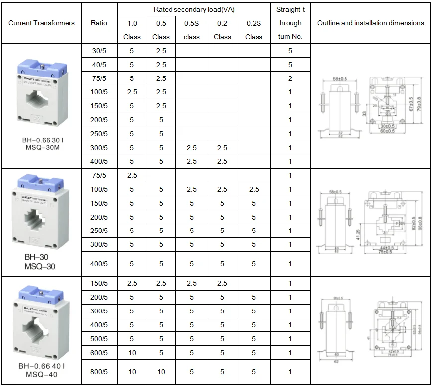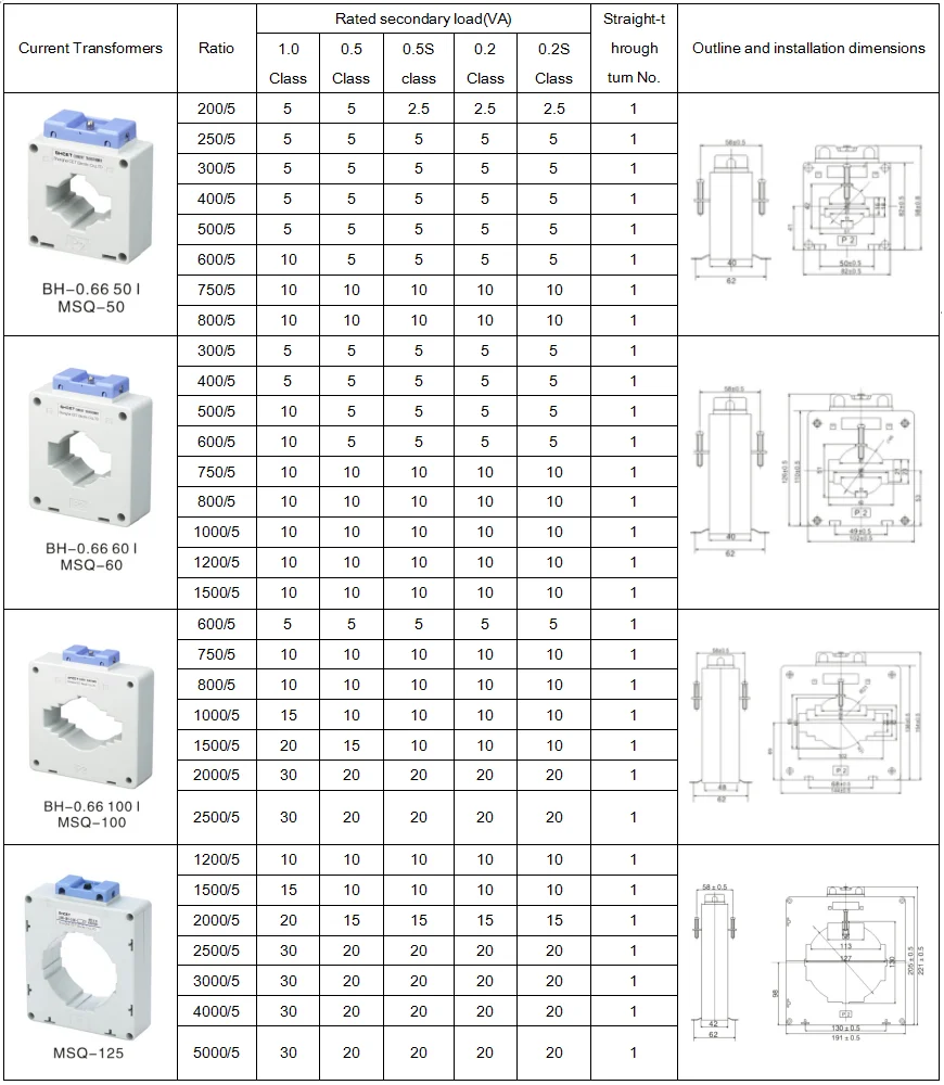 The MSQ current transformers is low voltage current transformer, it can be applied to test, control, display and record the running of the electrical equipment, and to protect the equipment against the damage, in the AC circuit with the rated voltage value below 660V and the frequency of 50/60Hz. The product can be also applied to form a complete set of mine transformer. It conforms to IEC 60185.