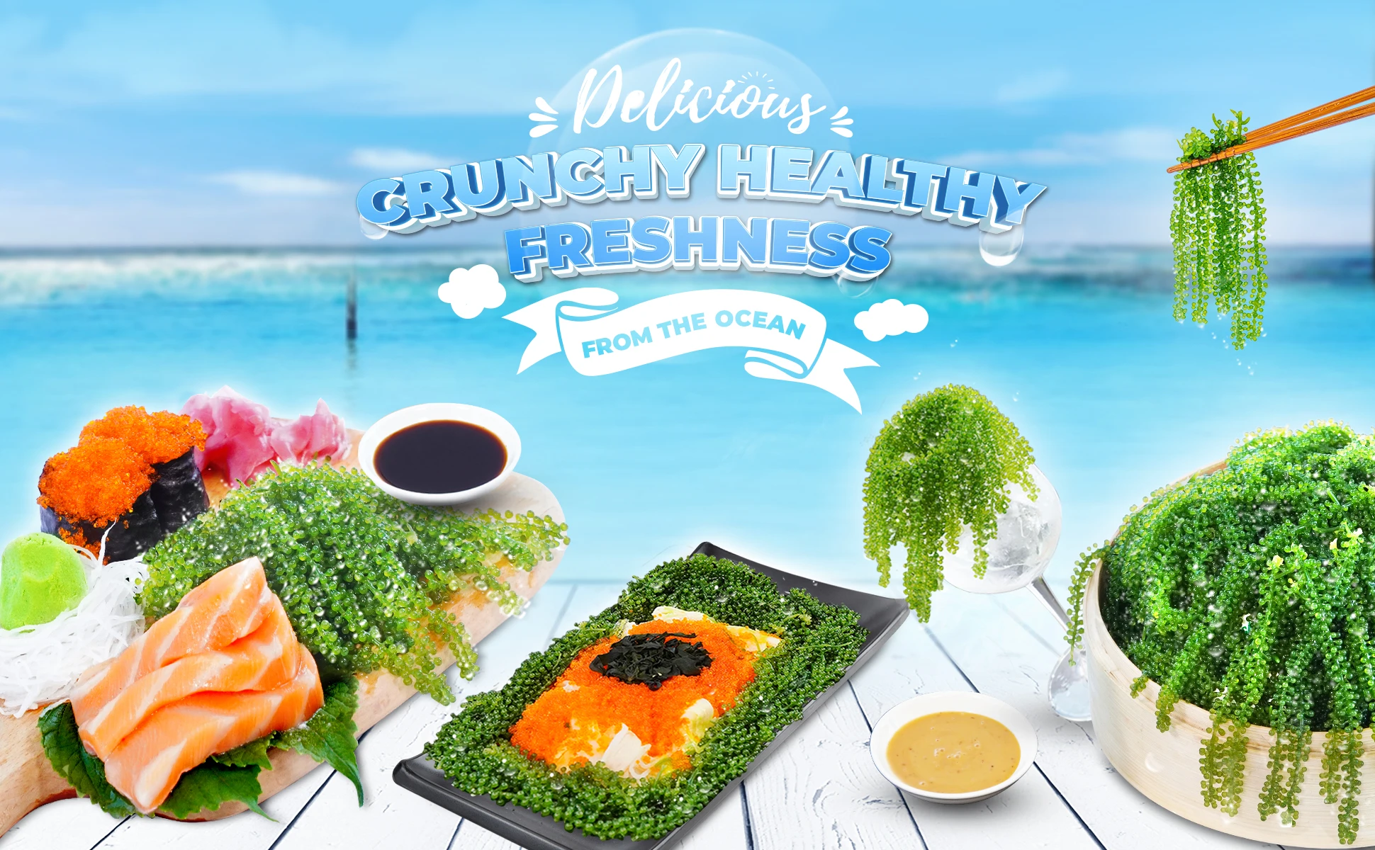 Usage | • Step 1. Put salted sea grapes in a bowl of clean water ( 1 liters of water for 40 grams of salted sea grapes ). Soaking for 2 -3 minutes, it will be refreshed again, 40 grams salted sea grapes bloom into 100 grams sea grapes • Step 2. Washing through with clean water 2 to 3 times. • Step 3. Soaking sea grapes into a bowl of clean water for 3 to 5 minutes or longer depending on the taste of each person. • Step 4. You can soak sea grapes in a bowl of ice water to make it more crunchy, cold and delicious. • Step 5. Having directly like vegetables with any sauces |