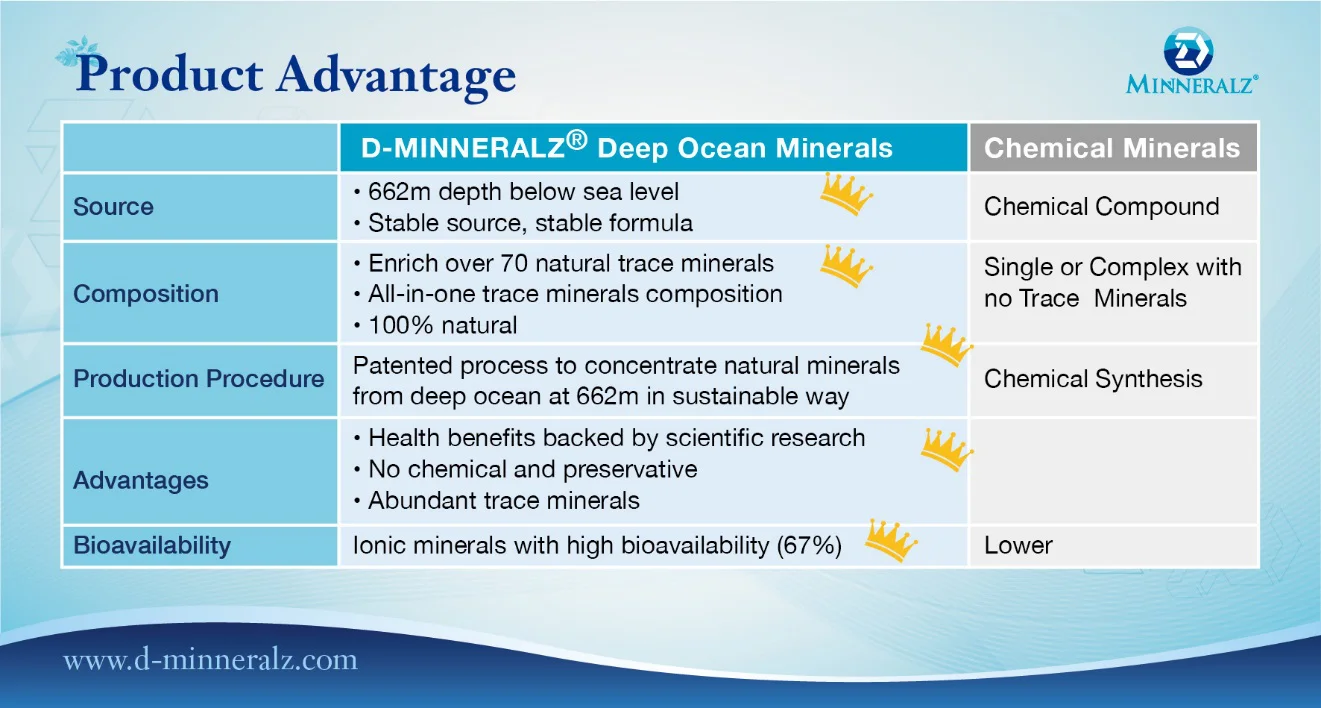 D-MINNERALZ deep ocean minerals from 662 m is 100% natural and clean and contains over 70 kinds of minerals and trace elements that the body needs. Our proprietary process ensures its unique minerals and trace elements composition. D-MINNERALZ is experimentally proven to deliver high bioavailability. Nowadays, the minerals in the market are mainly synthesized by a chemical process and contains no trace minerals. It is usually a single element.