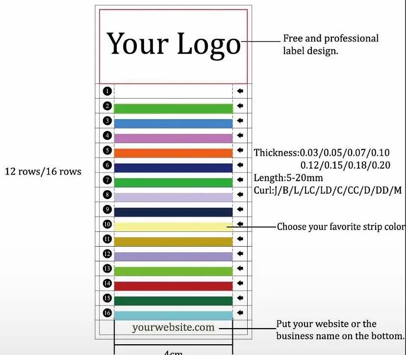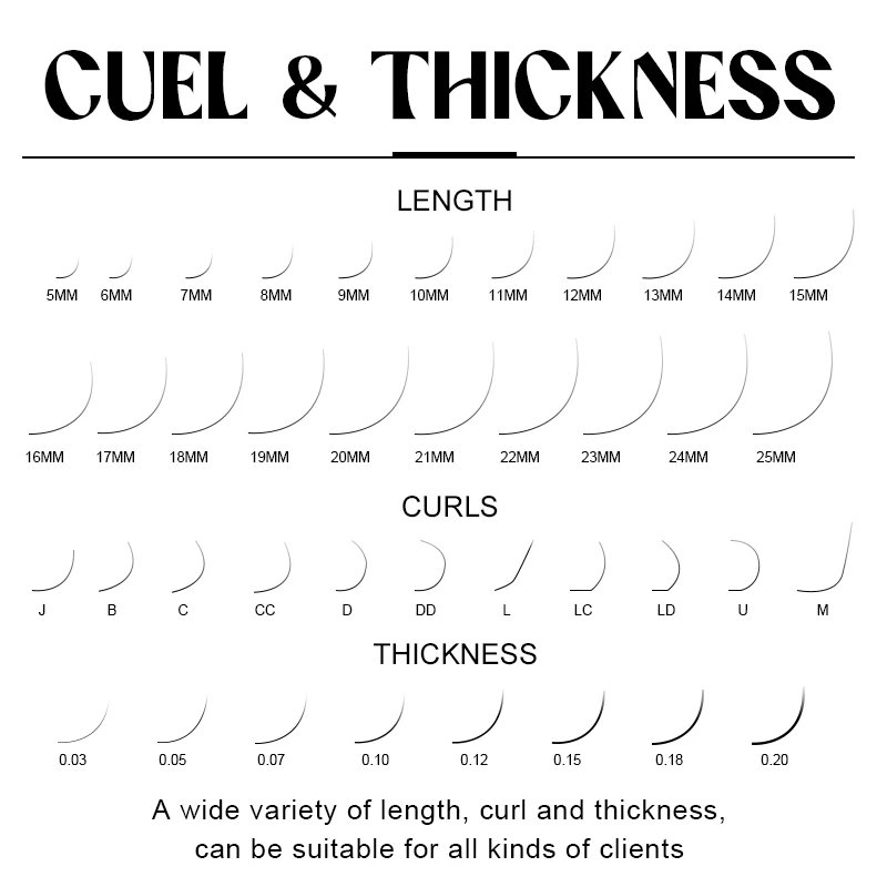 Thickness from 0.03mm, 0.05mm, 0.07mm…to 0.25mm. Curl with J, B, C, CC, D, DD, L, LC, LD, U, M Length from 5mm to 25mm |