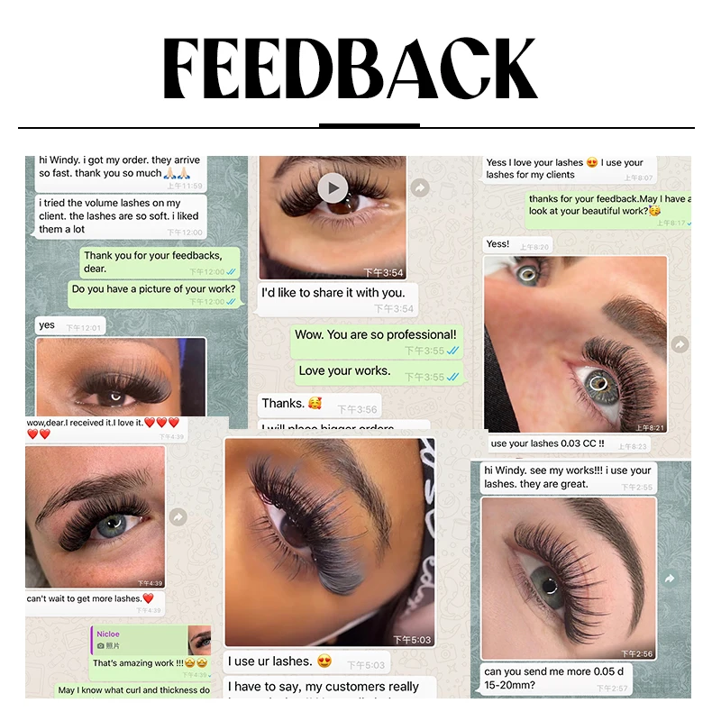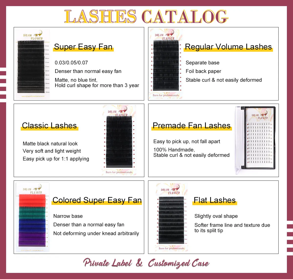 We have volume, classic, super easy fan, easy fan, flat, colored and super easy fan colored lashes. |