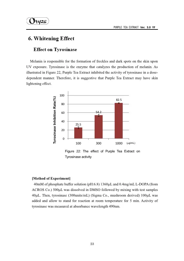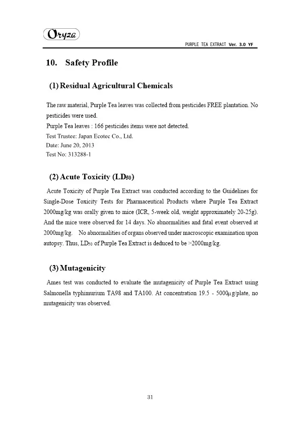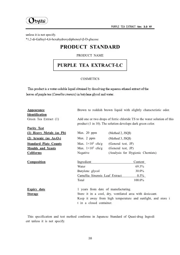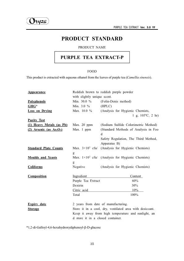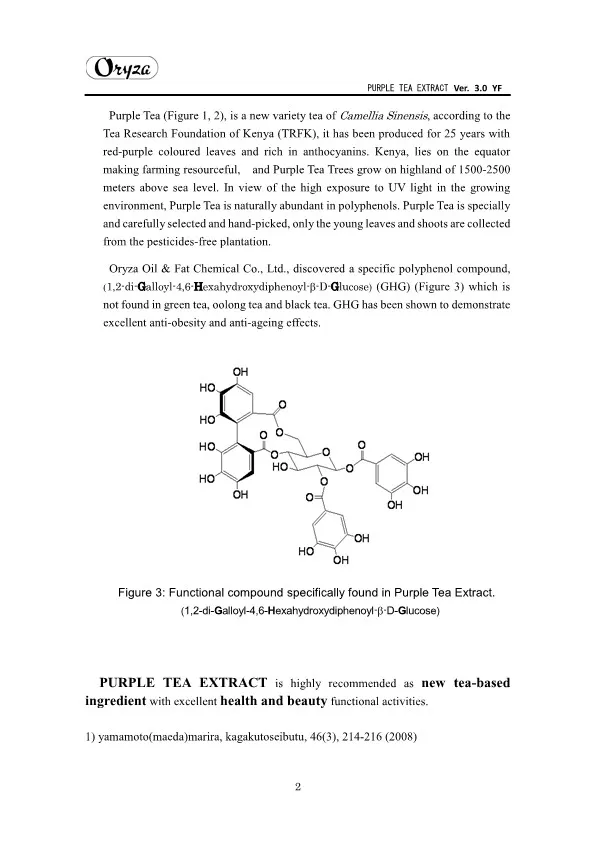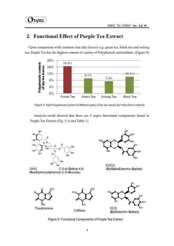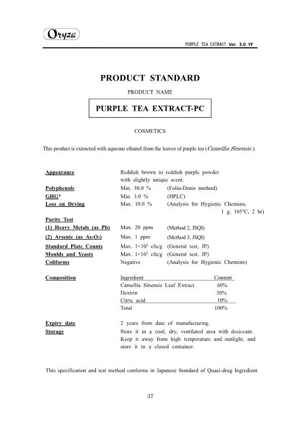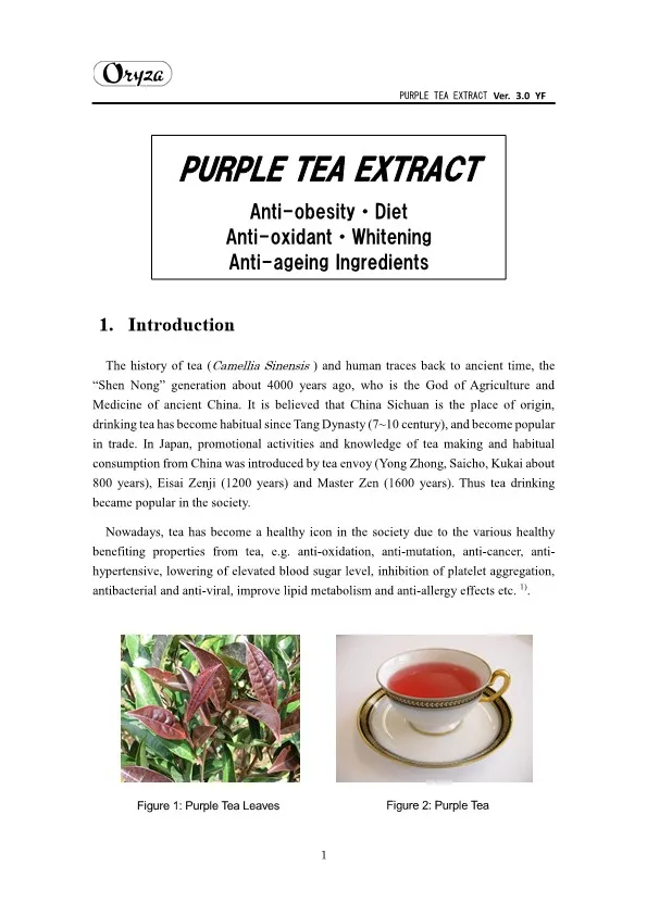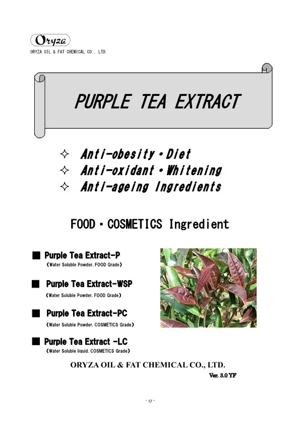 The main appeal points of PURPLE TEA EXTRACT are as follows. ・Weight controlling and beautifying effects ・Suppresses aging of skin ・Antioxidative effect ・Whitening effect
