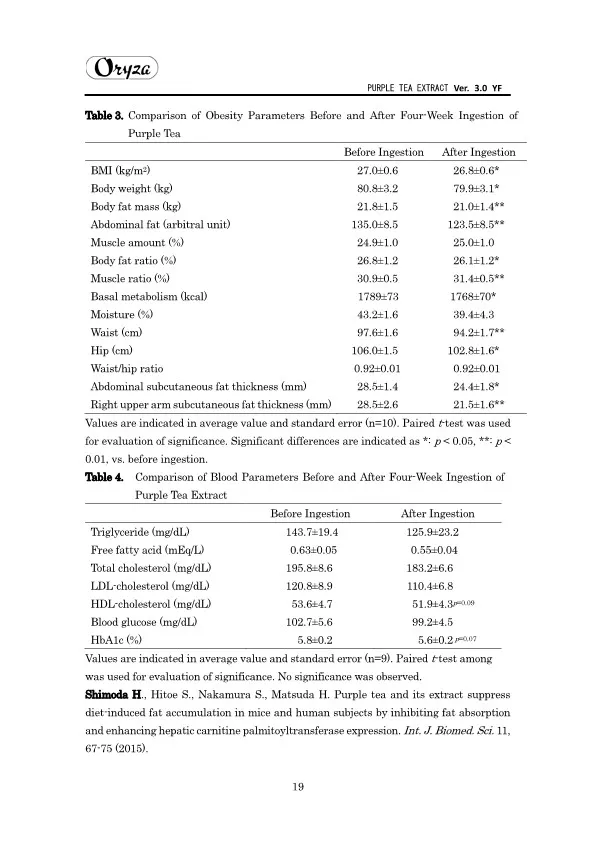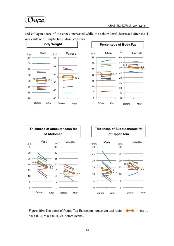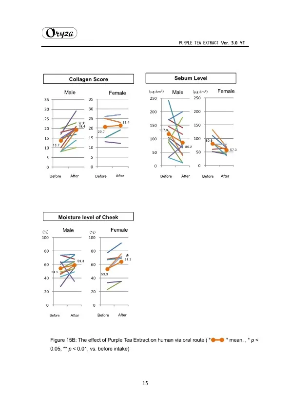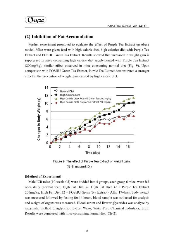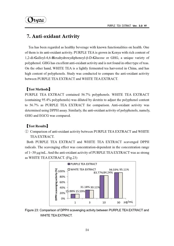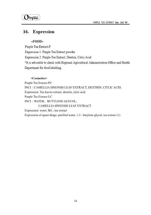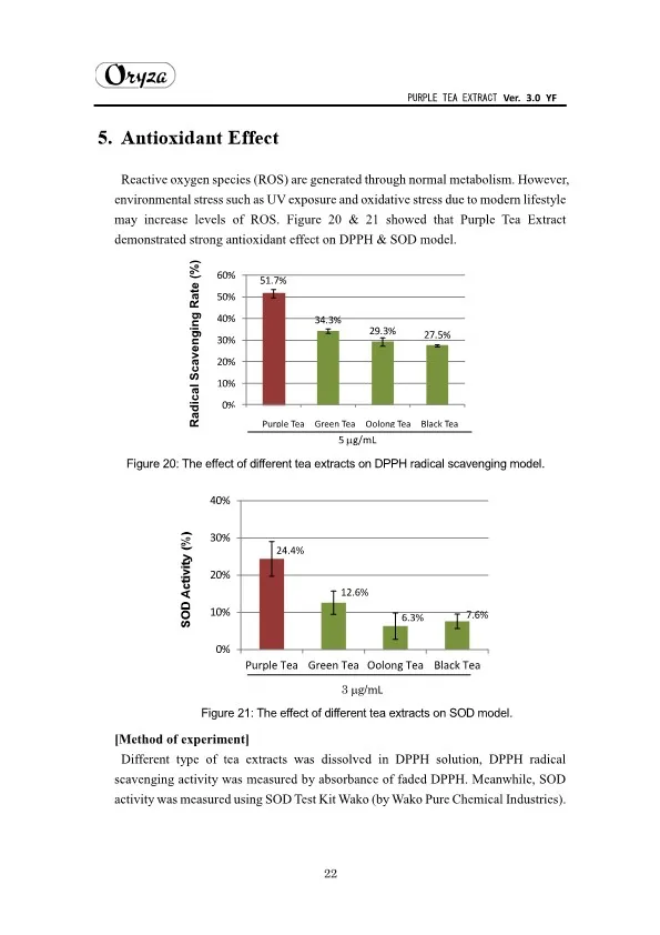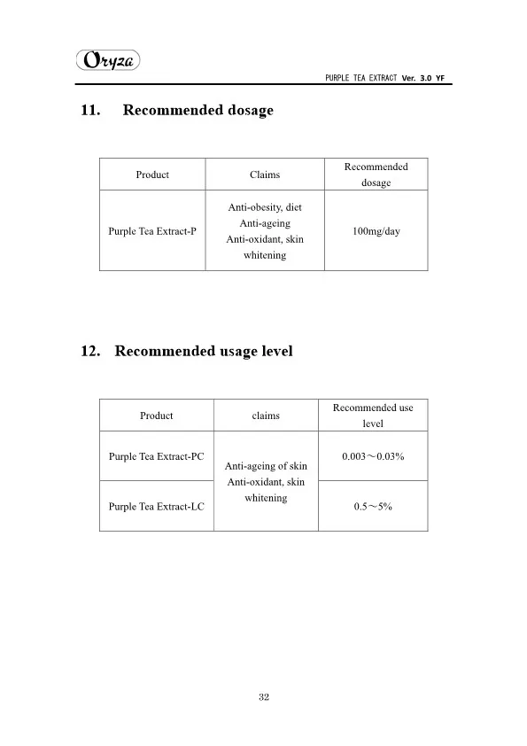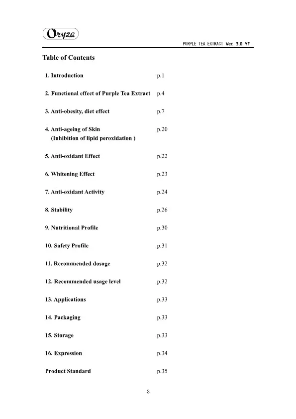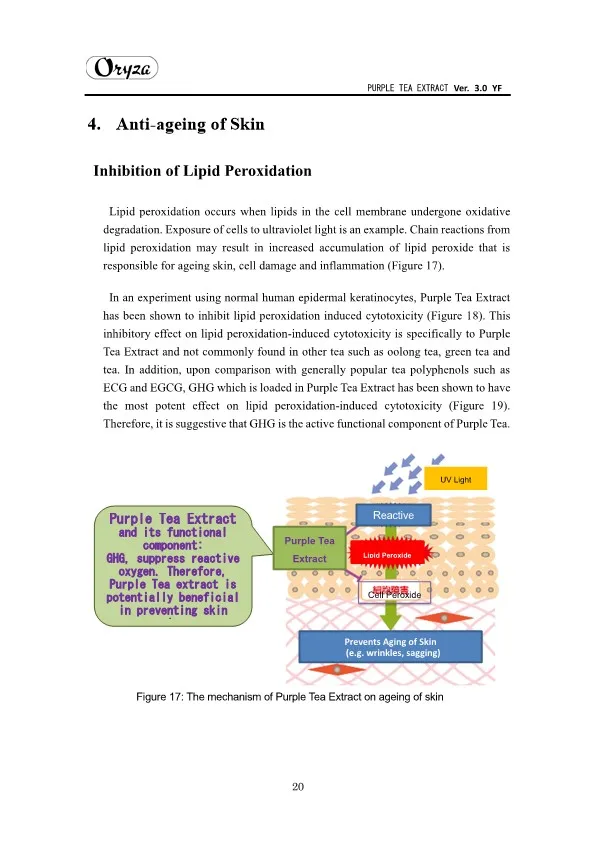 The main appeal points of PURPLE TEA EXTRACT are as follows. ・Weight controlling and beautifying effects ・Suppresses aging of skin ・Antioxidative effect ・Whitening effect