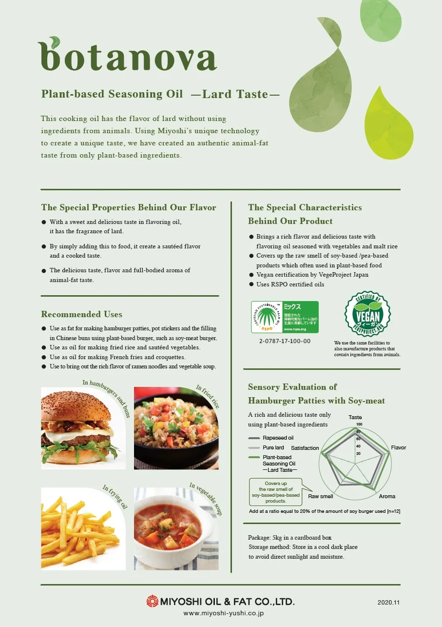 ・Seasoning Oils with an animal-fat taste for plant-based food.