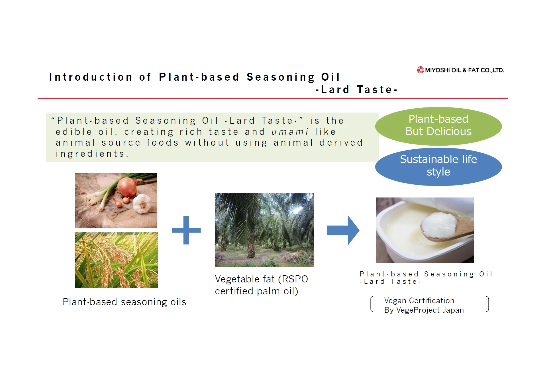 We are a manufacturer of seasoning oils which feature real animal-fat flavor from 100% plant-based ingredients. Our cutting-edge blending technology creates specialized flavors and tastes, outstanding one is ‘Umami’, a traditional Japanese flavor. Umami offers a unique, more complex flavor which is quite different from other basic flavors like typical garlic oils which are just made from plain oils + garlic.
