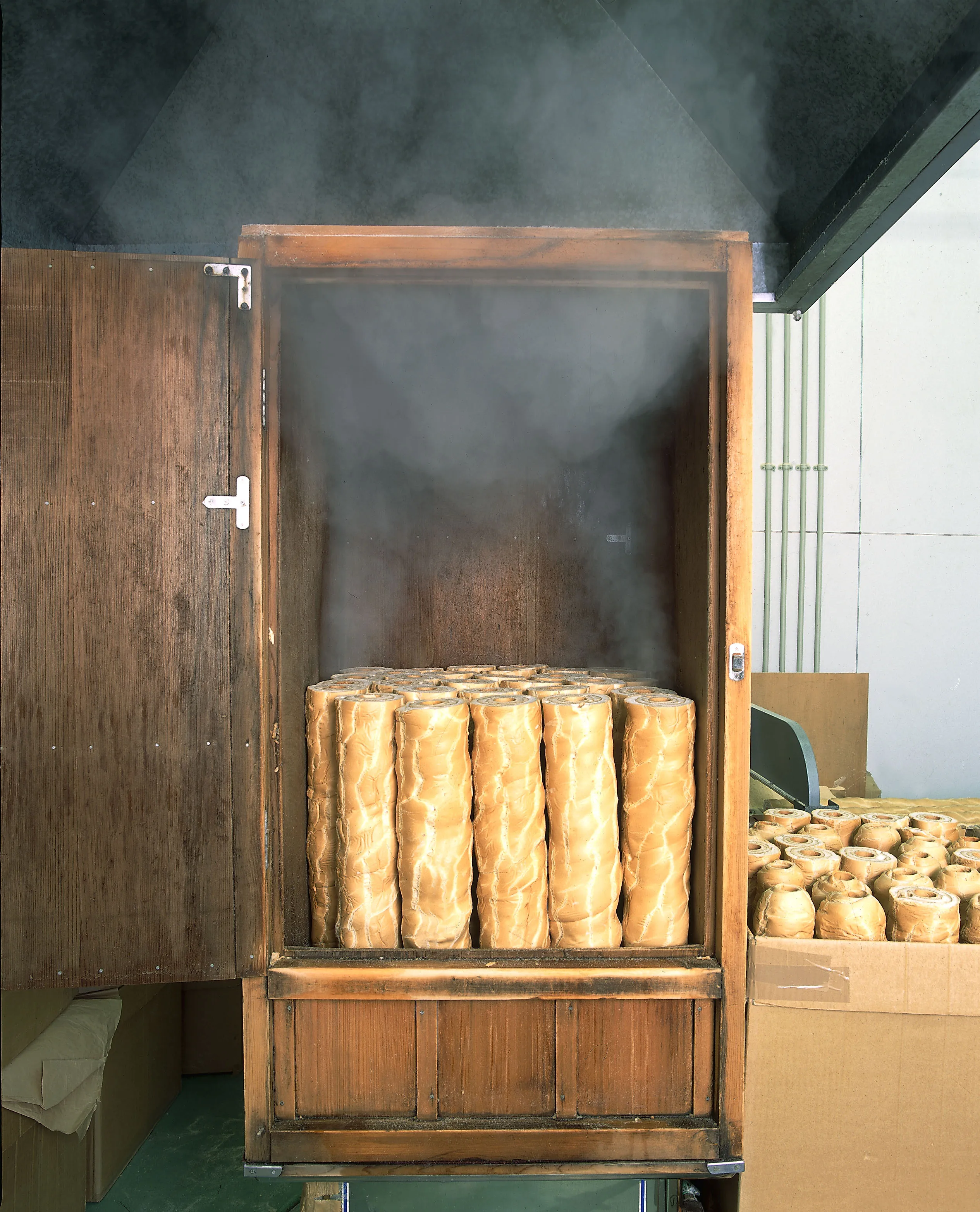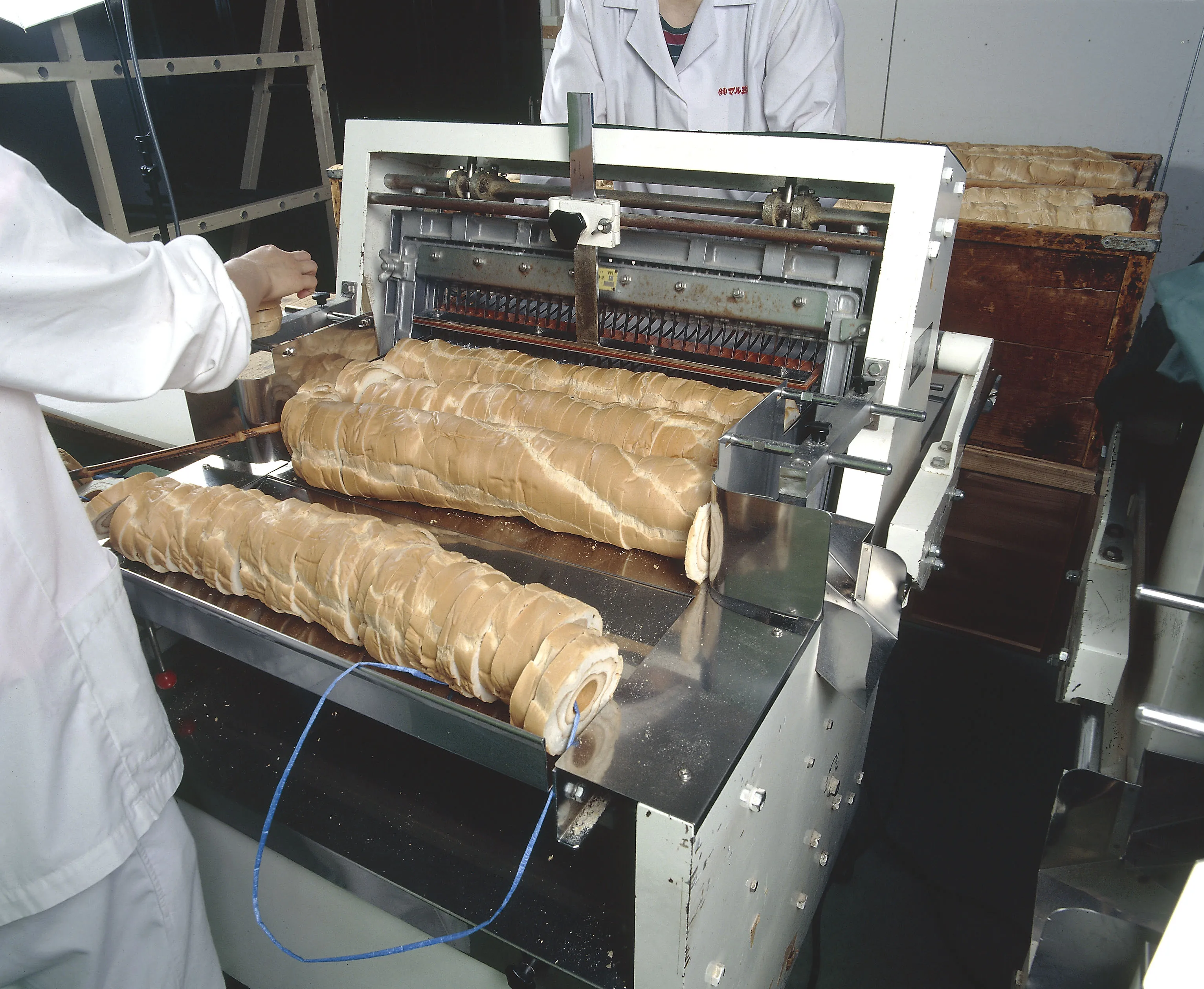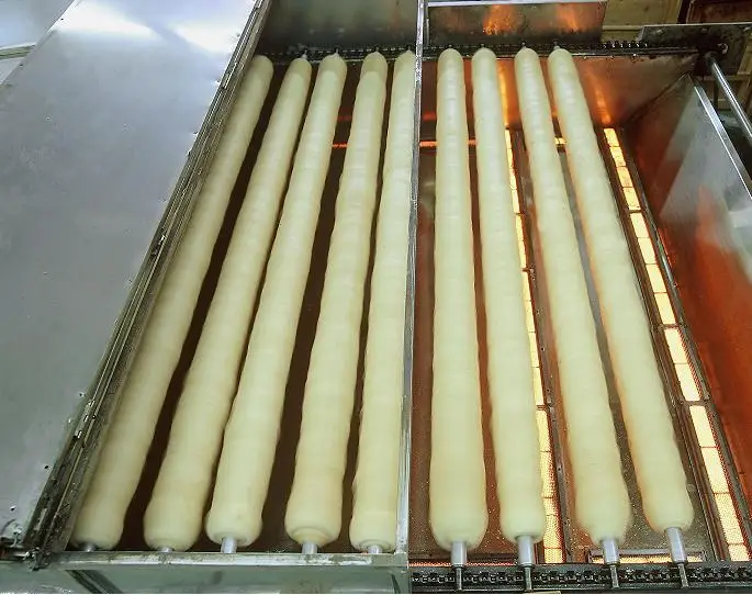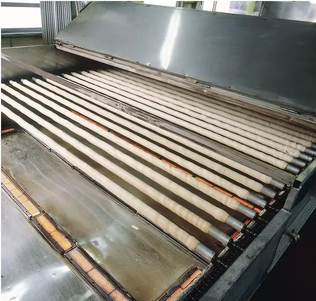 Put wheat protein around a stick, and then rolled over, repeat baking over and over again, and finaly cut it into slices.