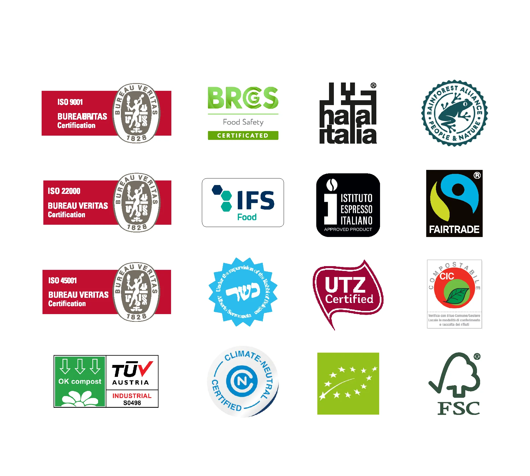 Certification | Fairtrade, Organic, Rainforest Alliance, UTZ, Climate Neutral, Compostable, FSC, ISO 14001, Smeta, Kosher, Halal, BRC, IFS, IEI Espresso Italiano, ISO 45001, ISO 9001, ISO 22000 |