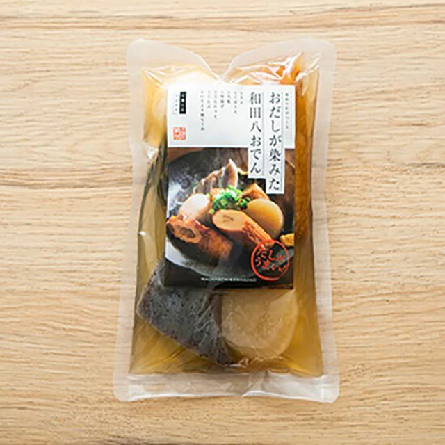 This product, "Odashigashimita Wadahachi Oden," is a retort containing goboten, konnyaku, radish, boiled egg, itoyori chikuwa, fried tofu, and kelp in a special soup stock made from long-established Osaka Sakai soy sauce. It's a type of oden.