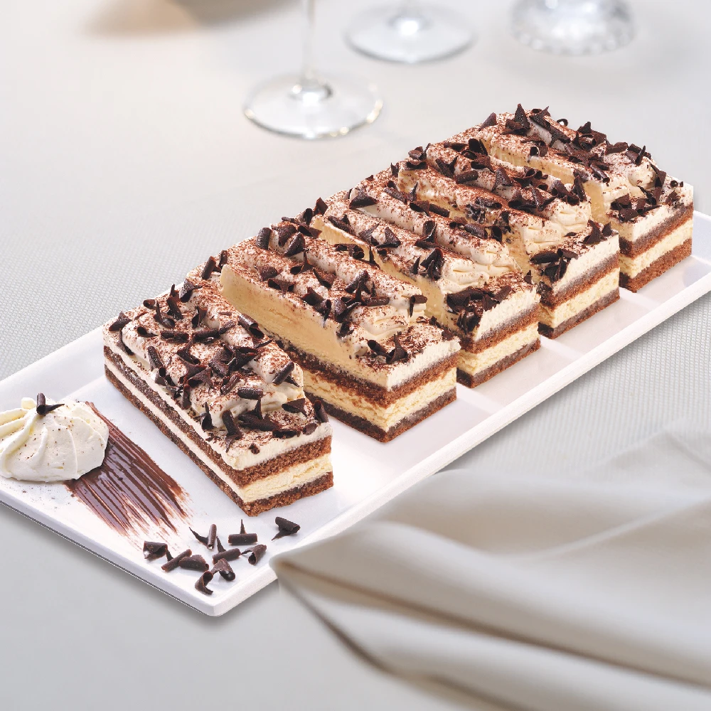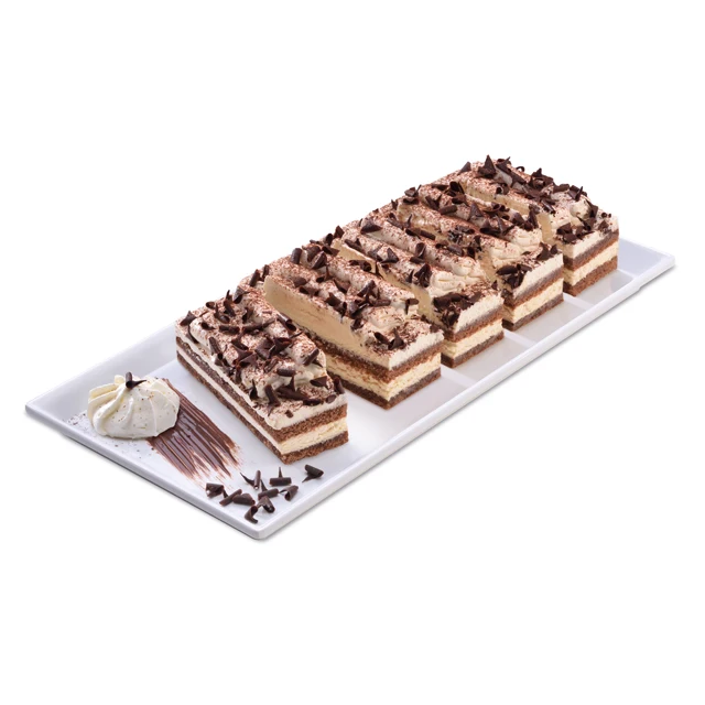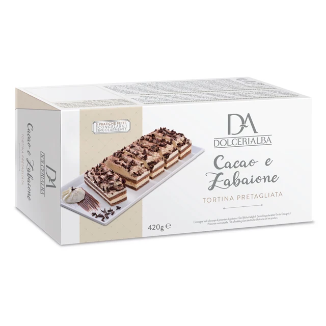 Cake on a paper flat tray into a customizable cardboard box, wrapped with shrink film. | ||||||||