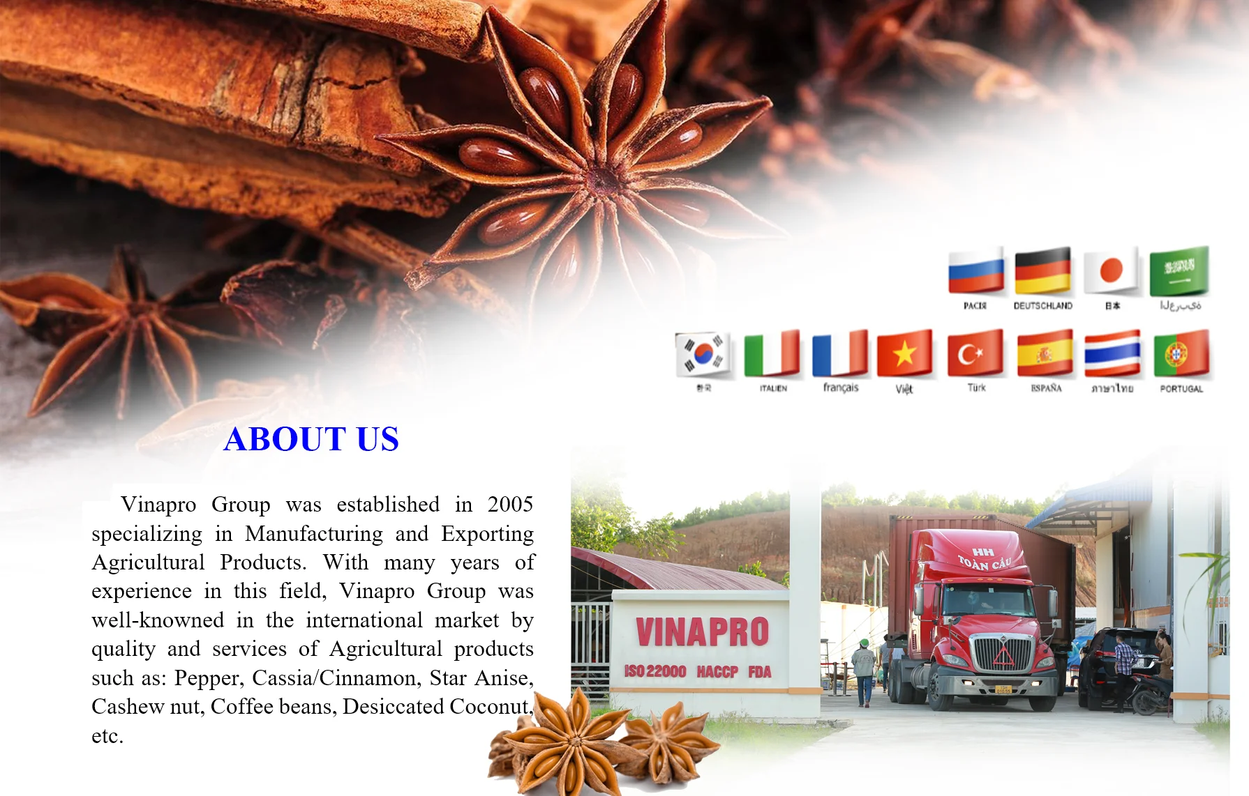 Cassia and Star Anise are processed directly at own factory in Hoa Binh province, which is near Hai Phong port. Pepper is in Gia Lai factory, cashew nut is in Binh Phuoc factory.