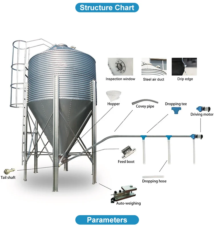 Silo feed system is a complete set of automatic feeding system, included a material conveying pipe, silo, auger, drive motor and a material level sensor. Main Feed line is mainly used to deliver feed from silo to the hopper in the poultry house. There is one feed sensor at the end of main feed line,which can control the drive motor on and off to realize automatic delivery feed.