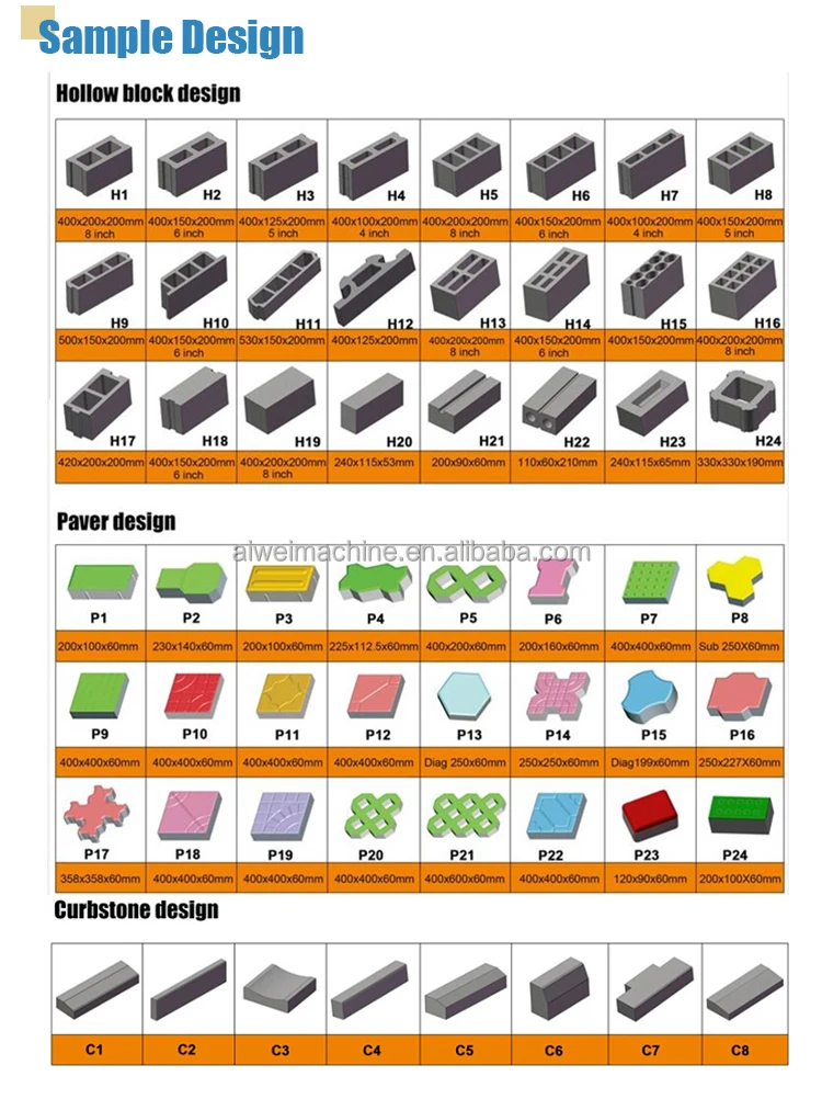 A: Our machines can produce different kinds of bricks by changing molds, such as hollow brick, solid bricks, paver brick, hourdis brick, curbstone and color brick. We can also customize for you.