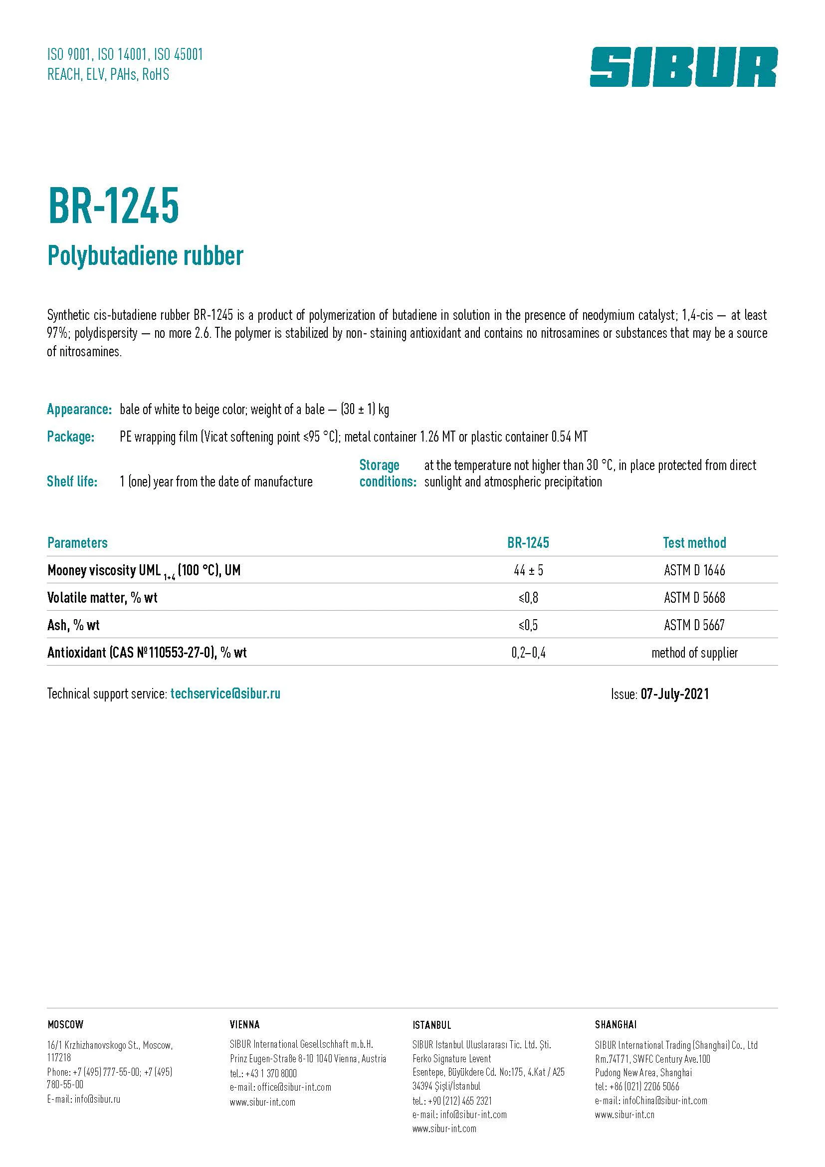 Synthetic modified cis-butadiene rubber BR-1245 is the polymerization product of butadiene in solution in the presence of neodymium catalyst; 1,4-cis - at least 97%; polydispersity - not more 2.5. The polymer is stabllized by non-staining antioxidan