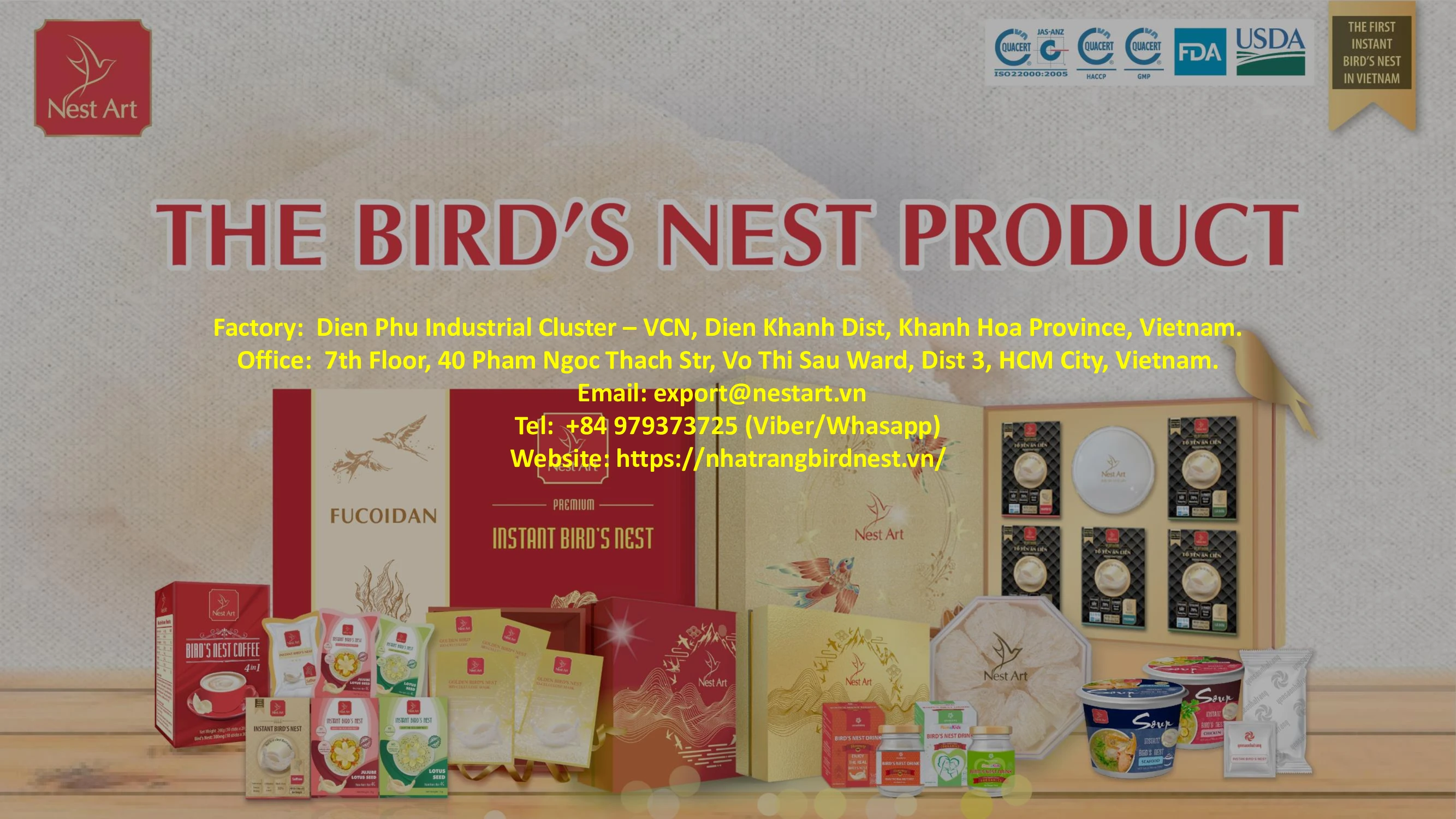We are a supplier and manufacturer of Bird's Nest Products as well as we own over 60 swiftlets houses with a factory based in Nha Trang – Khanh Hoa Province.
