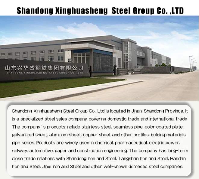 Shandong Xinghuasheng Steel Group Co., Ltd is located in Jinan, Shandong Province. It is a specialized steel sales company covering domestic trade and international trade.The company's products include stainless steel, seamless pipe, color coated plate,galvanized sheet, aluminum sheet, copper sheet and other profiles,building materials, pipe series. Products are widely used in chemical,pharmaceutical, electric power, railway, automotive, paper and construction engineering. The company has long-term close trade relations with Shandong lron and Steel, Tangshan lron and Steel, Handan Iron and Steel, Jinxi lron and Steel and other well-known domestic steel companies.