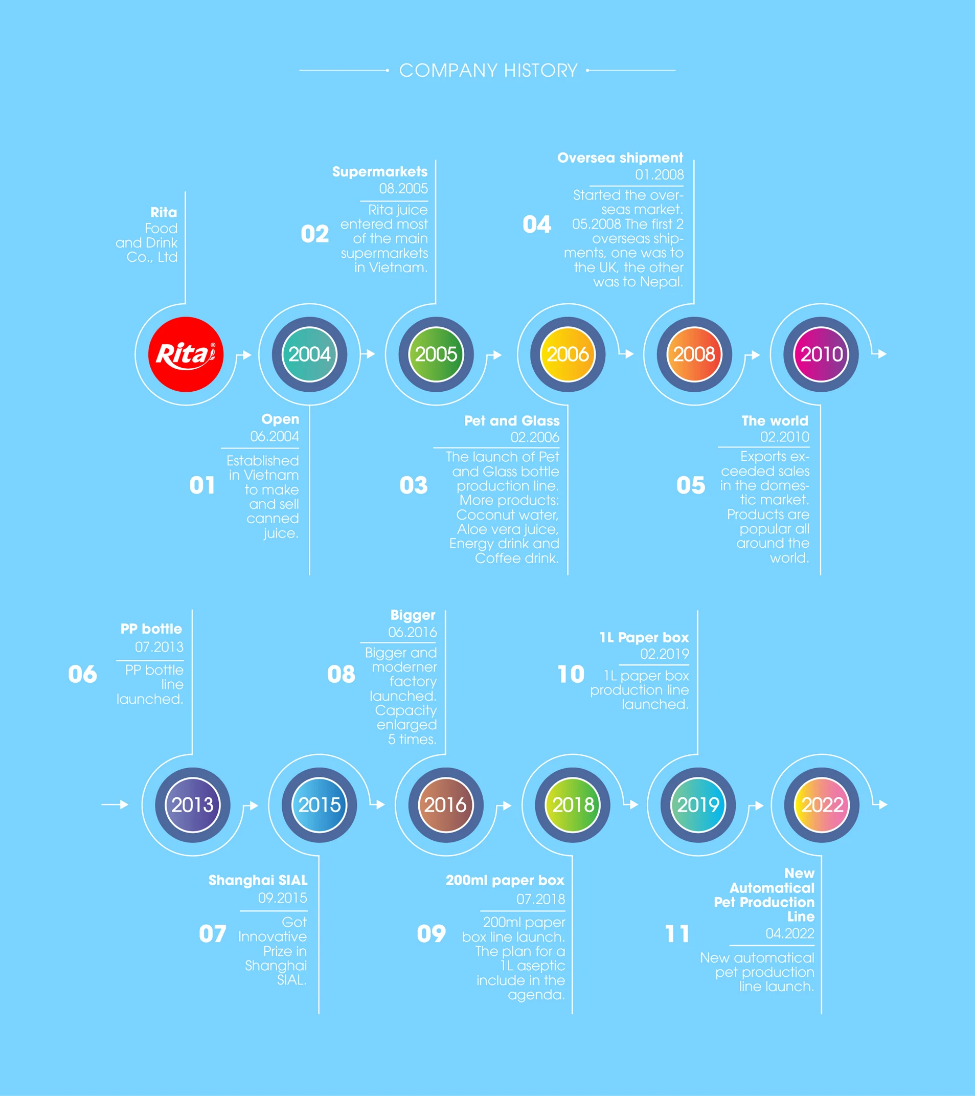 Rita is the leading juice manufacturer and exporter in Vietnam for more than 15 years, with the approval of HACCP, GMP, ISO, FSSC22000, HALAL, KOSHER, ORGANIC, etc. About 15 production lines to process packaging of can, glass bottle, pet bottle, pp bottle, aseptic pak, coffee cup, etc, available to make Fruit Juice, Coconut Water, Aloe Juice, Coffee Drink, Energy Drink, Tea Drink, Plant Protein Drink and so on.