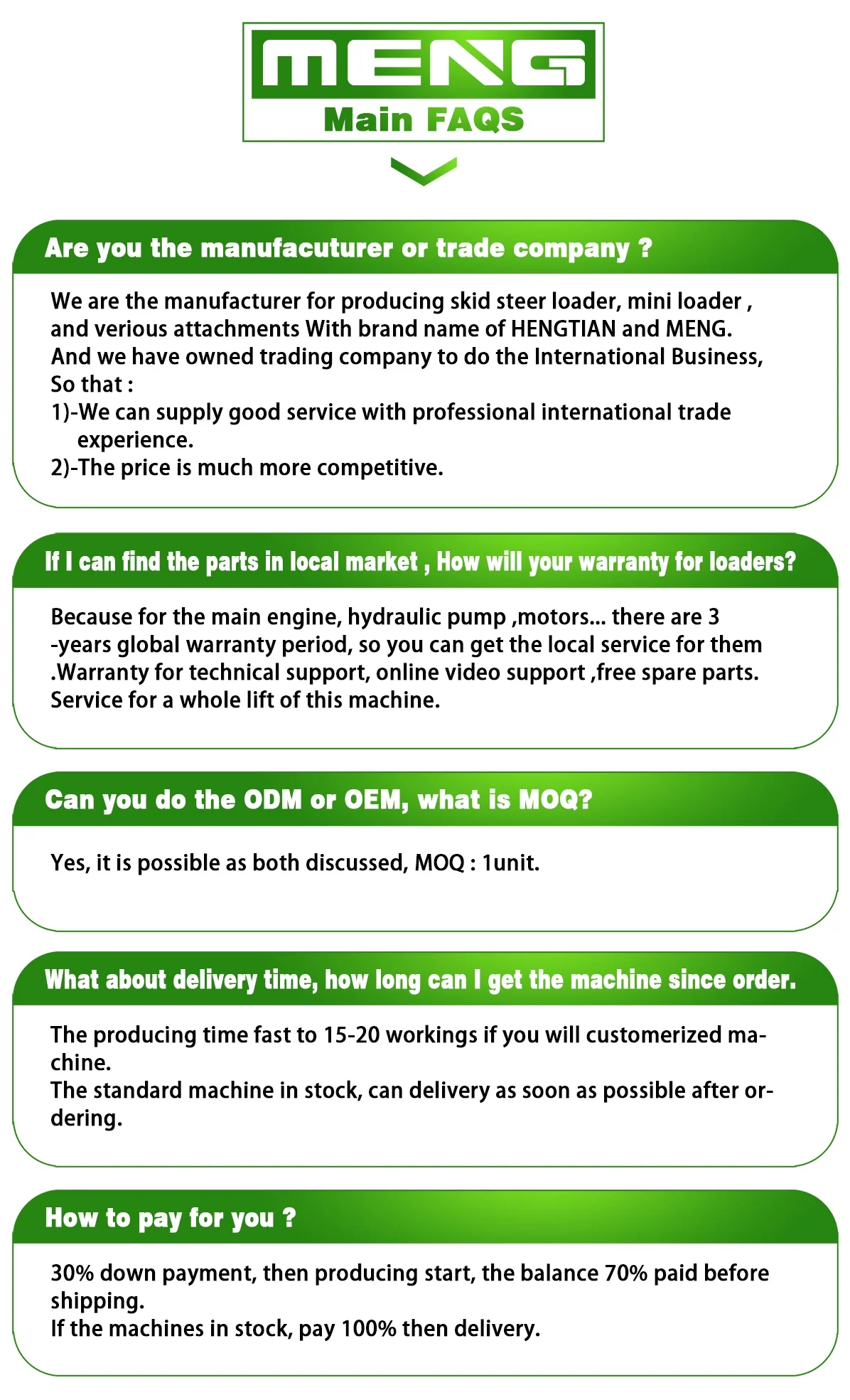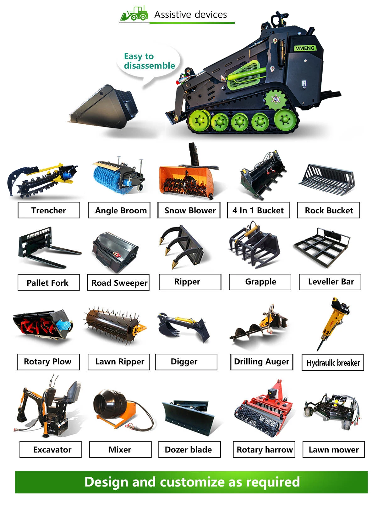 Main products are mini skid steer loader, skid steer loader, mini excavator, loader & excavator attachments, underground mining loader & mining LHD, explosion-proof loader, etc.