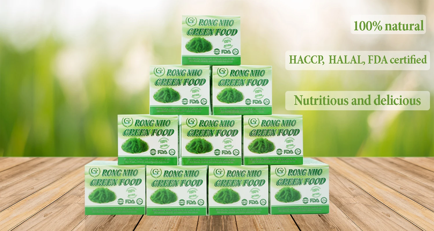 Usage | • Step 1. Put salted sea grapes in a bowl of clean water ( 1 liters of water for 40 grams of salted sea grapes ). Soaking for 2 -3 minutes, it will be refreshed again, 40 grams salted sea grapes bloom into 100 grams sea grapes • Step 2. Washing through with clean water 2 to 3 times. • Step 3. Soaking sea grapes into a bowl of clean water for 3 to 5 minutes or longer depending on the taste of each person. • Step 4. You can soak sea grapes in a bowl of ice water to make it more crunchy, cold and delicious. • Step 5. Having directly like vegetables with any sauces |