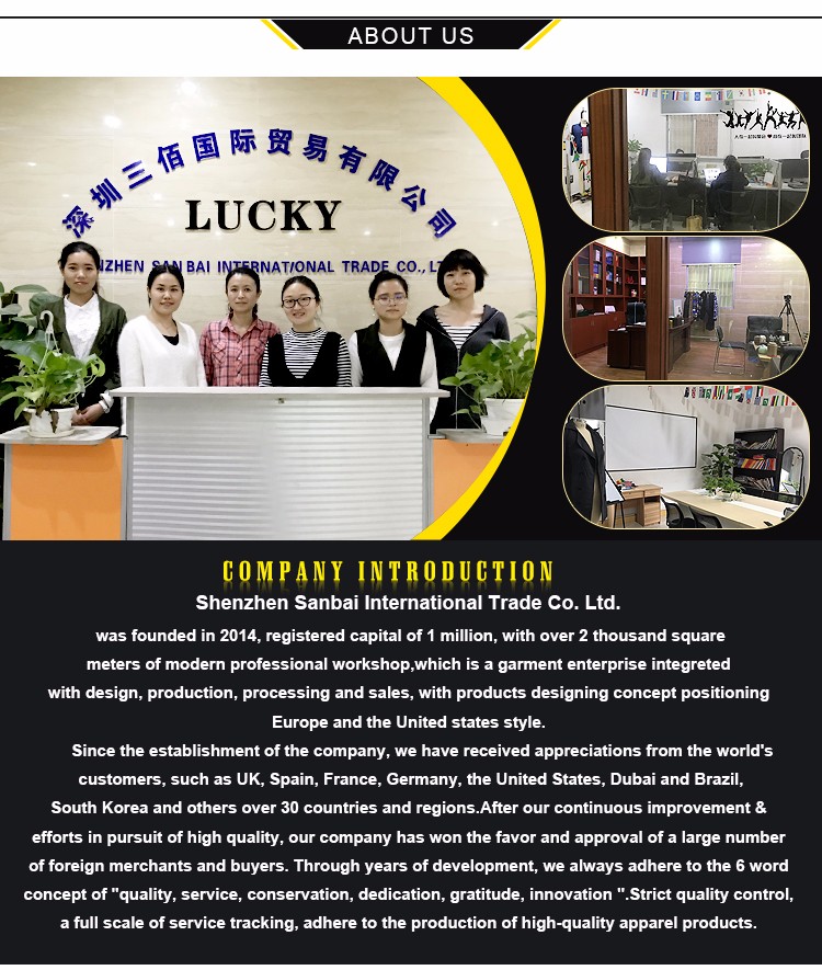 повезло моды является производителем одежды, заводе, расположенном в Провинции Гуандун, китай. повезло сделать OEM и ODM службы. клиент может иметь свой собственный дизайн/ярлык/логотип на модной продукции. повезло способны помочь вам создавать новые продукты и обогатить свою линию одежды.