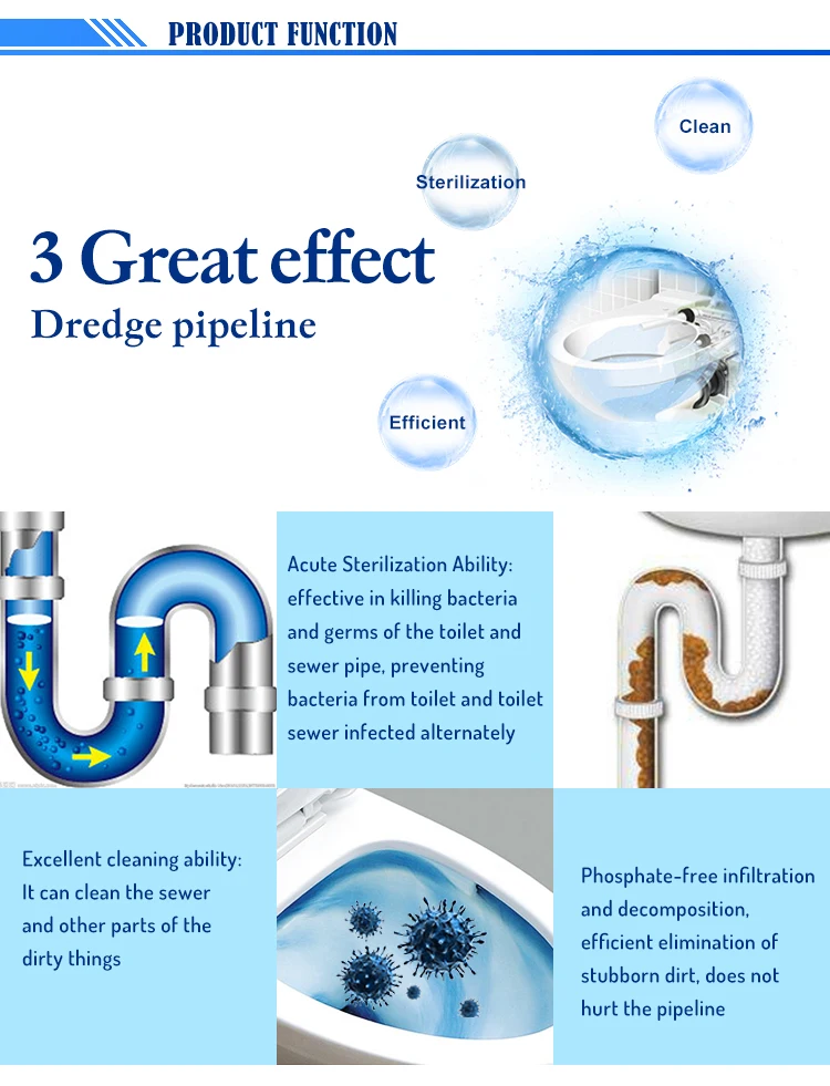 Feacture | 1. сильный ясно с высоким каустической соды и других композитных компонентов, полностью растворяется в сливной трубе волосы, жир, остатки пищи, белков, туалетная бумага засорение мусора, быстрая экскаватора трубы. 2. дезодорации и дезодорации: быстро покрытия поверхности источником загрязнения, предотвратить бактерии от размножения, сильный бактерий удаления и удаления запаха. 3. обслуживание трубы: очистить стенки трубы, не больно трубы, продлить срок службы трубы. |