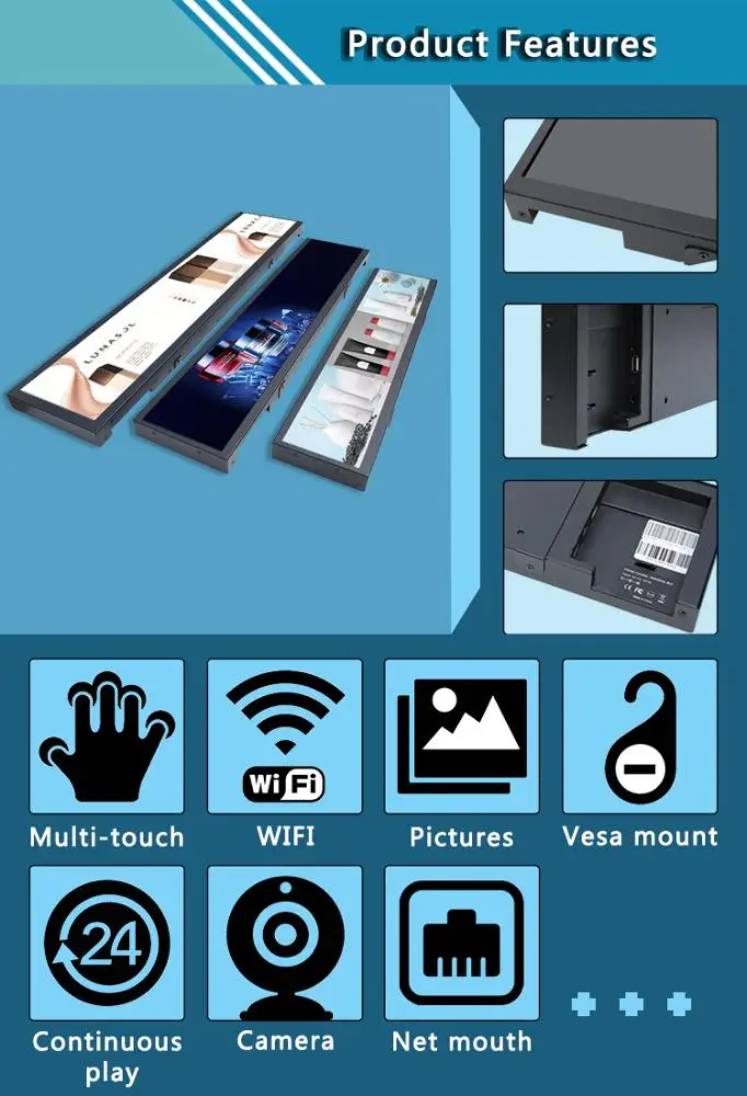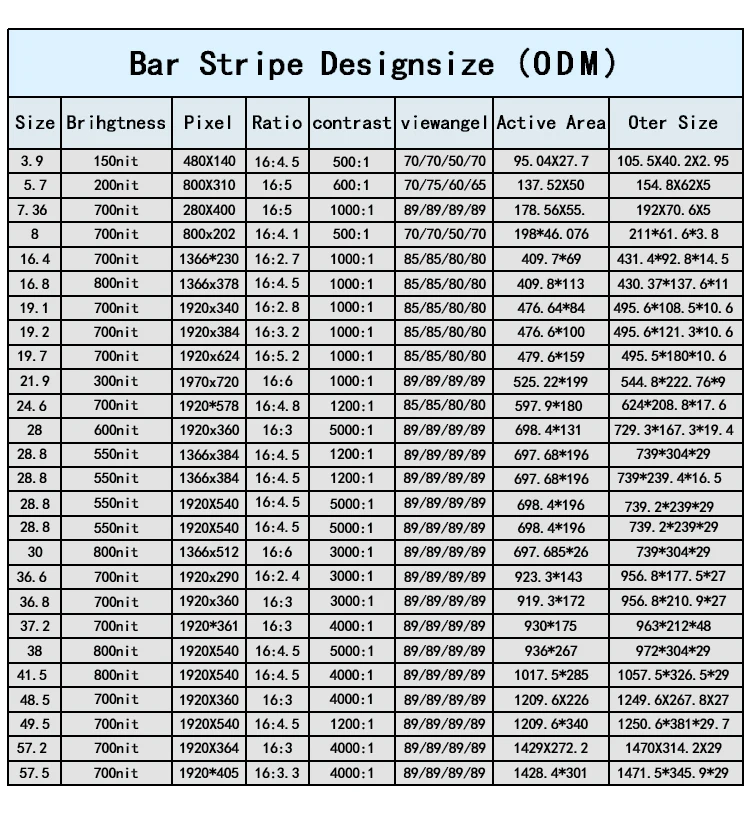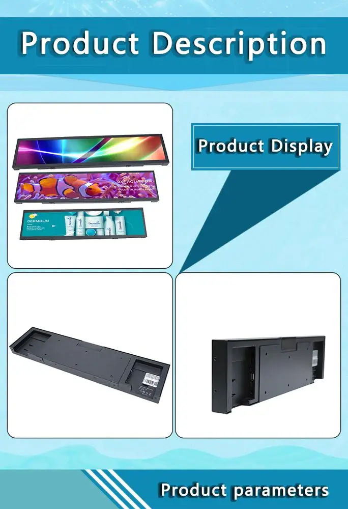 | 21 "бар экран (3,9 "~ 59" вариант дизайна, мы можем конструировать размер экрана согласно заказчику). Мы сделали 21 "/23,1/28,8/37/38/43,8 (4 К)/ 44,8/48,5/57,5/86/88 "перед | |