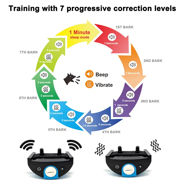 TZ-PET690V dog barking control collar with 7 correction levels, level 1-2 is only warning sound, level 3-7 is warning sound & vibration. If your dog no barking in 40 seconds, this device will stop working and back to level 1. If the continued stimulate reaches level 7, the collar will stop working and get into 1 minute sleep mode.