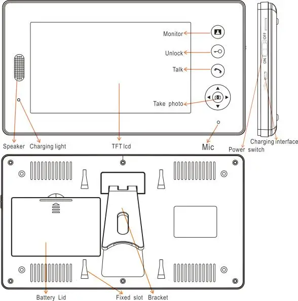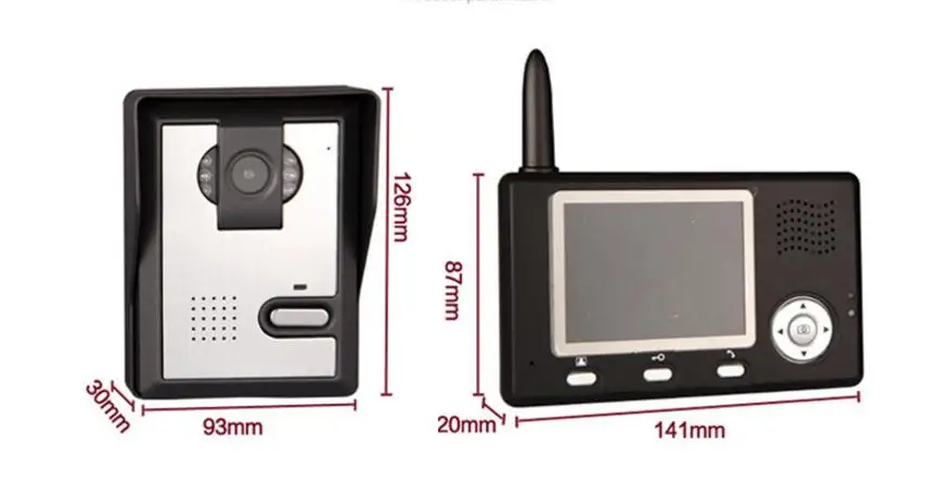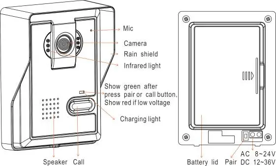 (1) 2,4 GHz цифров псевдослучайного изменения рабочей частоты и технология шифрования, дальность передачи до 400 метров в свободном поле (2) четкое ночное видение ИК-выключателем. (3) Защита от дождя для наружной камеры доступна (4) мониторинг, разблокировка, звонки в режиме громкой связи (5) 16 мелодий chord, громкость мелодии, громкость разговора регулируются (6) внутренний монитор может делать фотографии автоматически или вручную, Он может хранить до 100 фотографий (7) поддерживает включение и выключение питания (8) одна наружная камера поддерживает 4 внутренних монитора и наоборот (9) Размер наружной камеры: 126 × 93 × 42 мм, CMOS 300k пикселей, Мощность: AC 8 ~ 24V, DC 12 ~ 36V или 3200mAh батарея Размер внутреннего монитора: 236 × 130 × 18 мм, аккумулятор 3200 мАч Режим ожидания для наружной камеры и внутреннего монитора: 2 месяца |