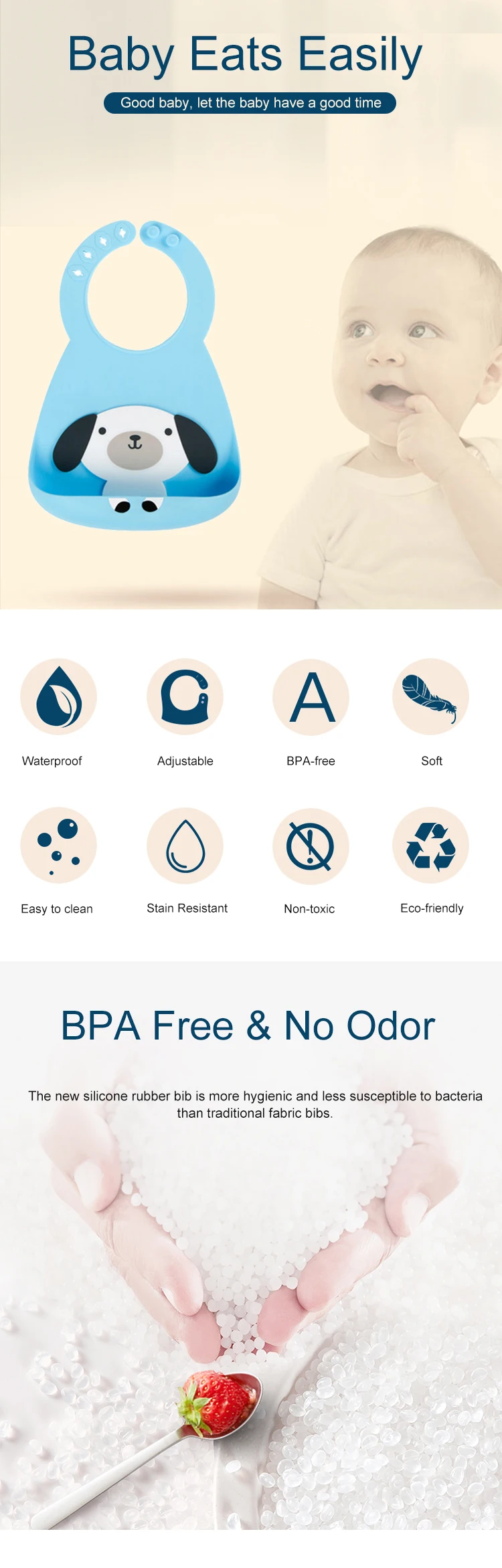 Ребенок; Пищевой силикон устойчив к пятнам и не впитывает воду, легко моется и в посудомоечной машине, просто используйте мыльную воду для