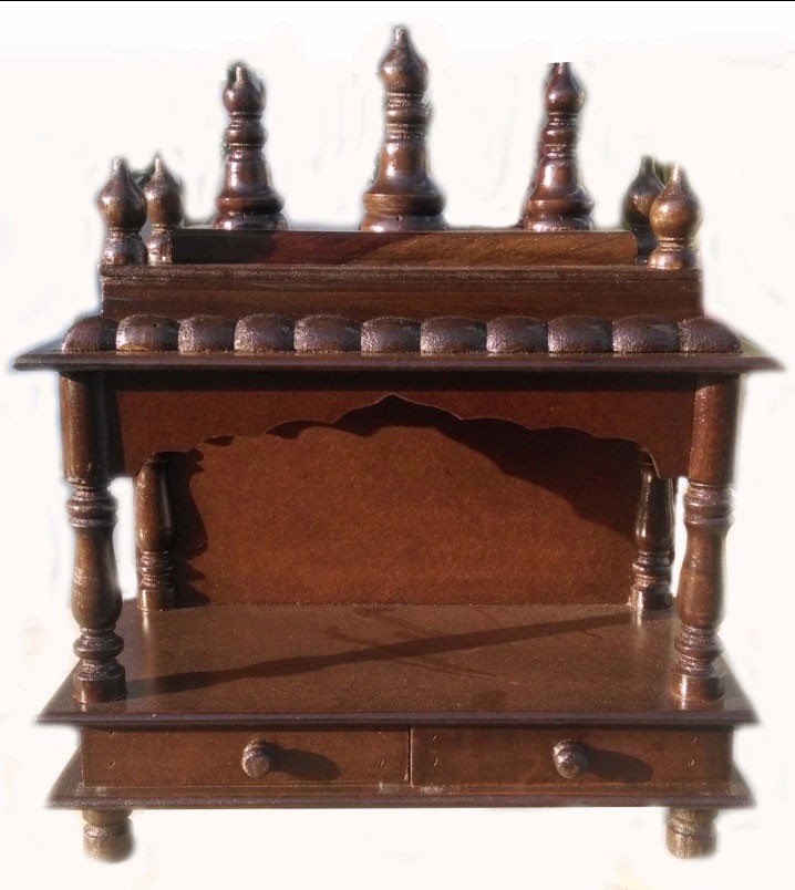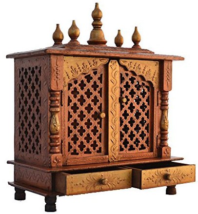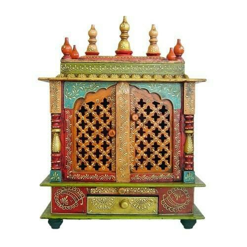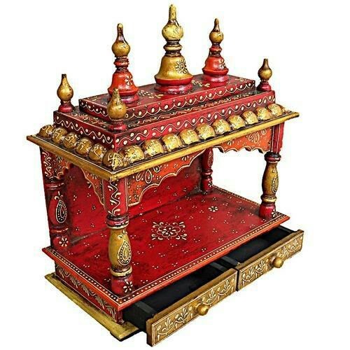 деревянный храм ручной росписью, имеет два ящика для хранения всех Pooja предметы первой необходимости и имеет резной двери. она имеет тиснение ручная роспись дизайн меди и золотой цвет, который дает ему глаз броский вид. вы можете разместить статуя бога твоего, в этом храме, и это повысит положительные атмосферу вашей пуджа комнате. This temple is sure to bring a положительную ауру в вашем дома.