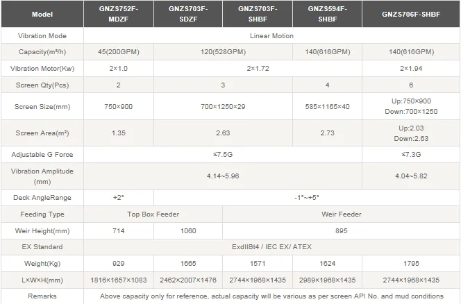GNZS703Серия 3 ПанельСухие остатки виброситоМожет использоваться в качестве основного шейкера сланца и шейкера для сушки десандера и демилтерных конусов. конструкция линейного движения с регулируемой высокой силой G делает GNZS703 очень популярным для любых типов бурения, включая: бурение нефтяных газов, бурение CBM, HDD, водная скважина, геотермальная скважина, чистка бурового раствора. Простой, но сверхмощный дизайн делает шейкер GNZS703 сланцевым имеет надежную работу с меньшим обслуживанием.