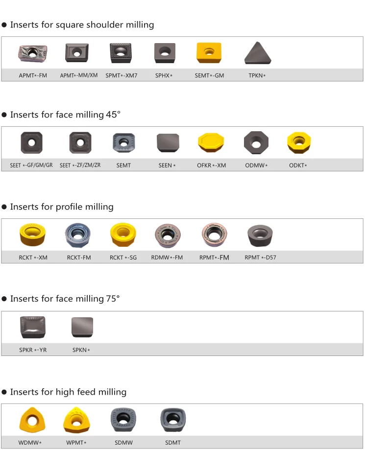 Milling inserts: | SEKN, SPKN, RDKW, RPMW, TPCN, TPKN, TPAN, APKT, APKT, R290, R390, R490, R590. |