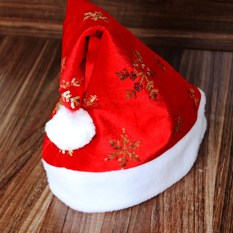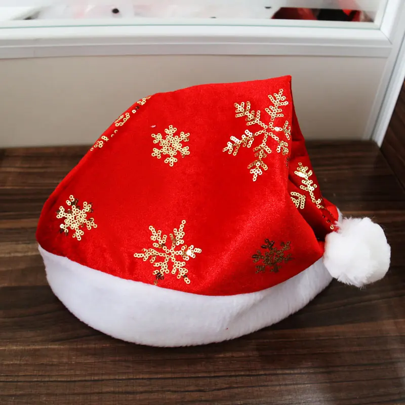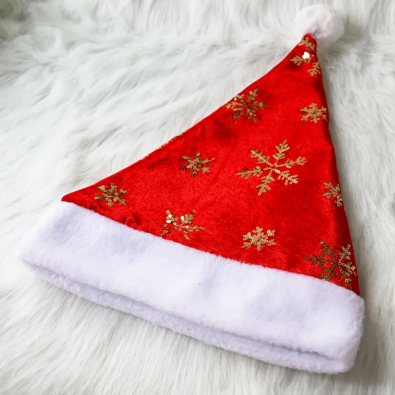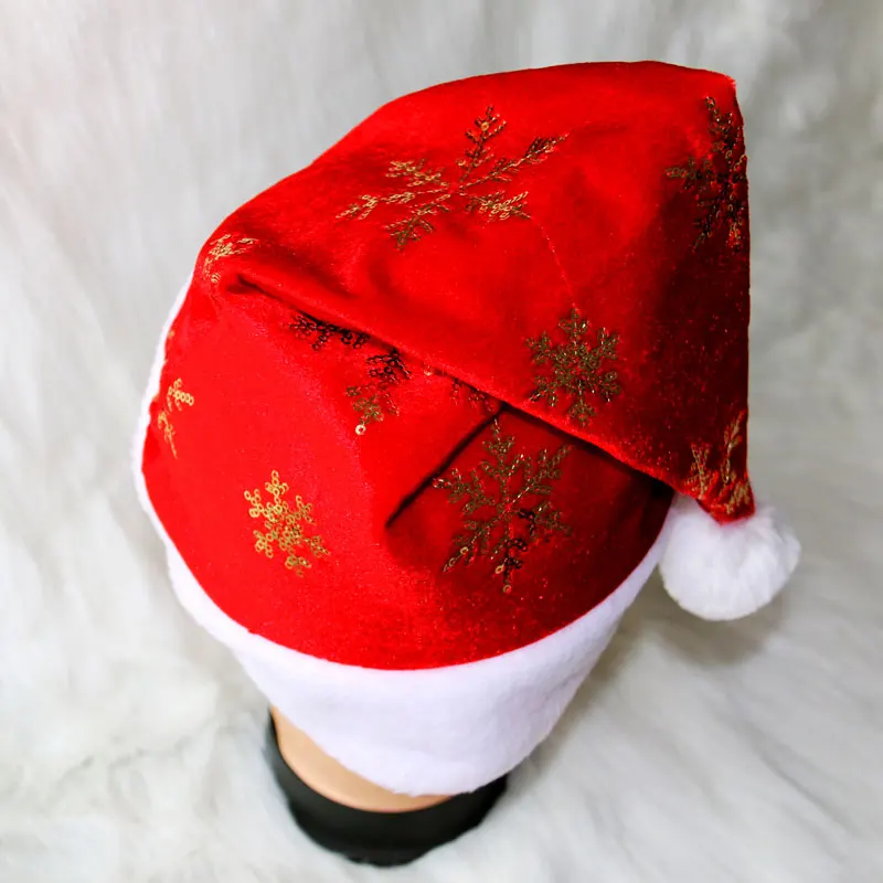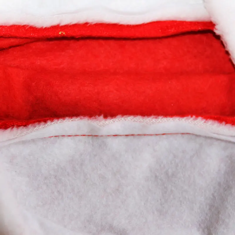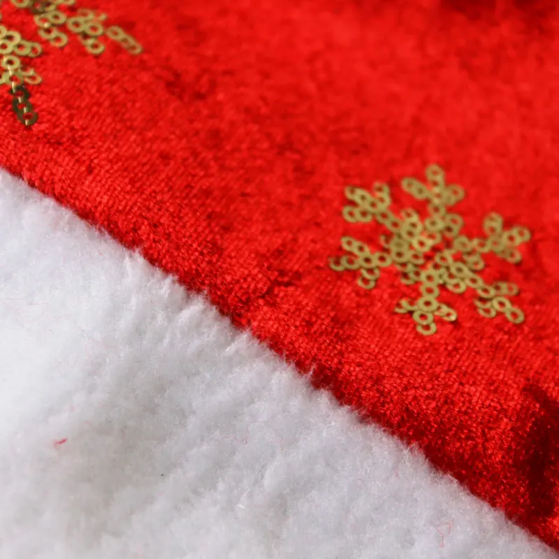 Material: Red Flannelette with sequins snowflakes and compounded red felt inside; short white plush fabric for band