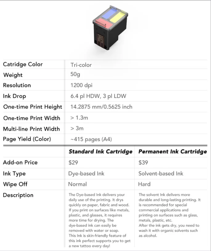 Мы используем самостоятельно Разработанный чернильный картридж PrinCube, который идеально подходит для печатающего Куба. И да, он также совместим с цветными чернильными картриджами HP62 и HP804 (поддерживаются как стандартные, так и XL, а также HP64, но Расположение цвета не так хорошо, как HP62 и HP804).