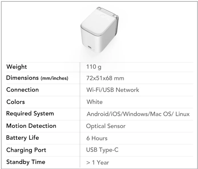 Революционный компактный дизайн PrinCube освобождает пользователей от стола. Он беспроводной, работает по Wi-Fi и легкий и ультра-портативный. Всего 72x51x68 мм он достаточно мал, чтобы поместиться в карман или сумку и путешествовать в любом месте.