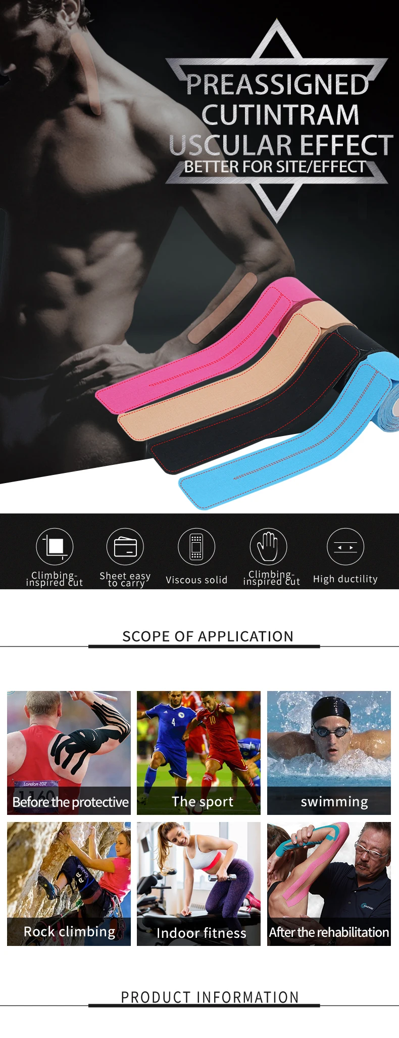 use | It helps reduce tissue pressure and support muscles and joints. Studies show this sports tape helps you recover faster from pain; Used for knee pain, shoulder pain, shin splints, back pain, plantar fasciitis, tennis elbow, and much more |