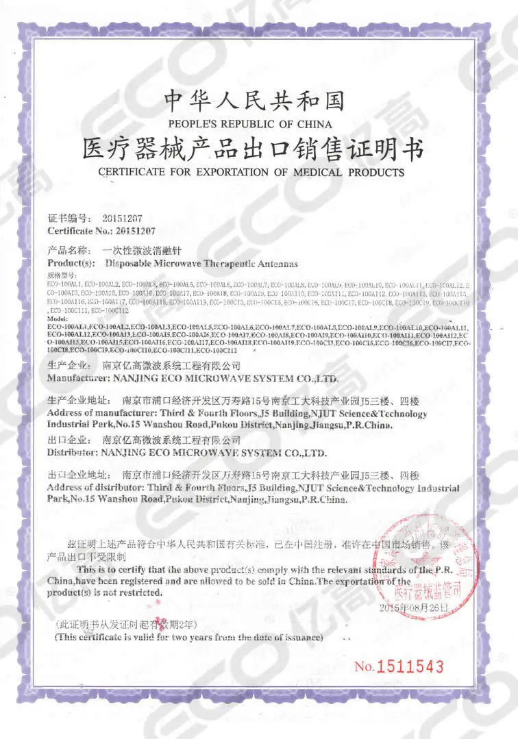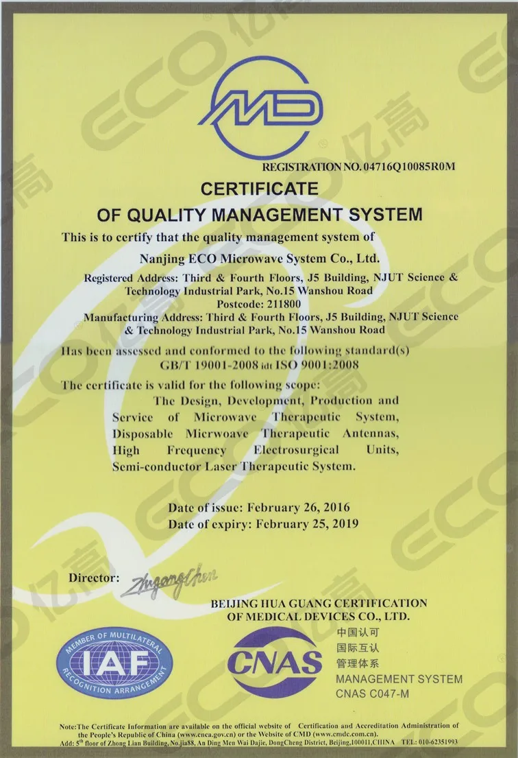 With advantages of rich talents resources and established healthcare industry environment at Nanjing, ECO Microwave cooperates with many universities at home and abroad, and adopts innovative ideas to products. In microwave field, ECO Microwave is a pioneer in Percutaneous Microwave Coagulation Therapy(PMCT), Varicose Veins Therapeutic Unit, Argon Electrosurgical Unit and Radiofrequency Therapeutic Unit. Last but not least, ECO Microwave is also developing many types of laser products for customers' requirements.